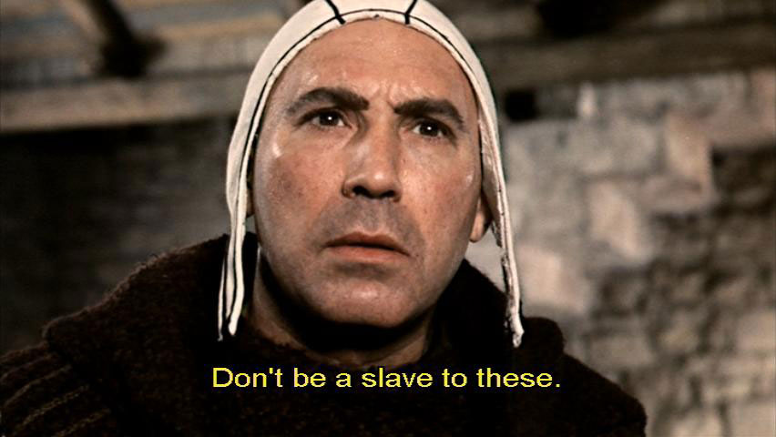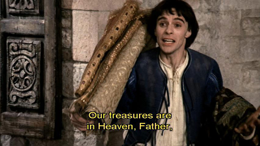 [Francesco] Father, Father, I want to share my joy with you. Our treasures are in Heaven, Father, not here on Earth. Don't be a slave to these. Throw it all away. Do as I do.