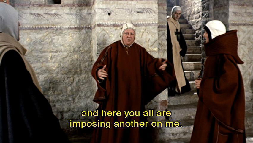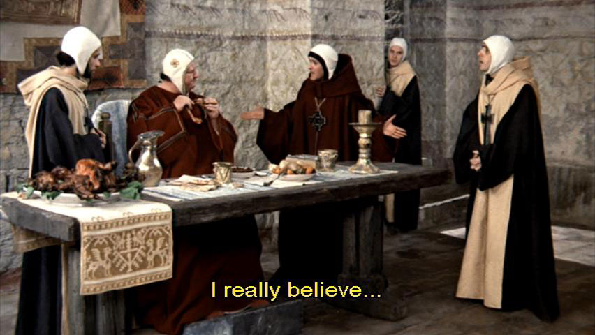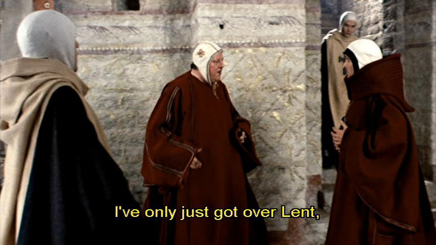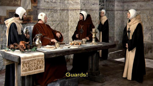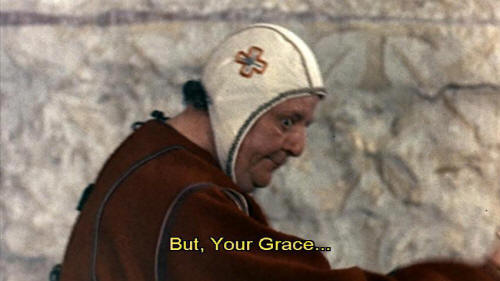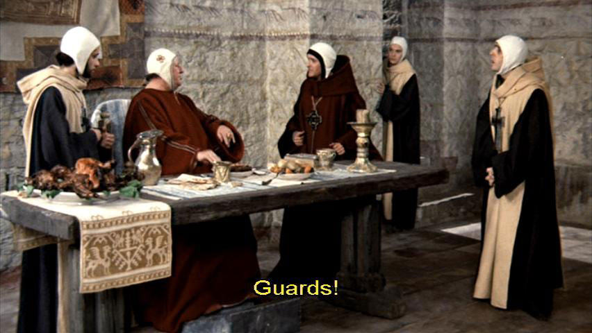 I really believe ... [Bishop Guido] Guards! I've only just got over Lent, and here you all are imposing another on me. [Cleric] But, Your Grace ... [Bishop Guido] Have it kept hot.