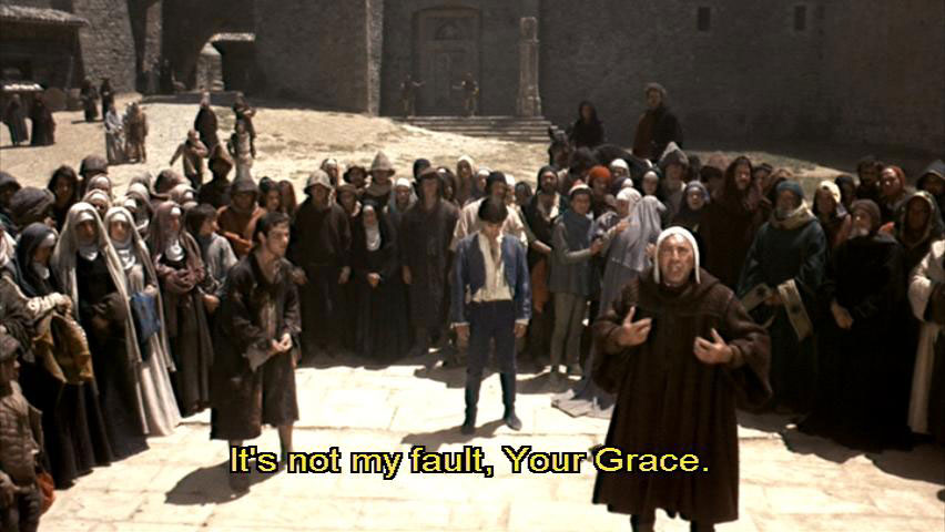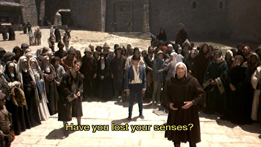 of saying our office. What's the matter with you, man? Have you lost your senses? [Pietro di Bernardone] It's not my fault, Your Grace. It's him -- that lunatic there. [Francesco] Yes ... it's me.