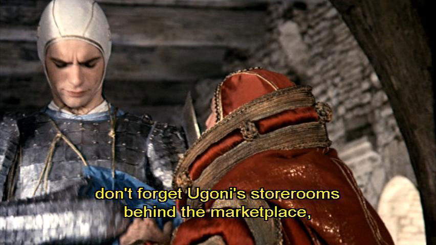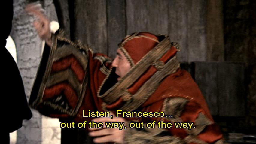 A true son of his father, eh, Pica? [Pica] We are going to be late for mass, Monsignor. [Pietro di Bernardone] Ah, they'll wait. Listen, Francesco ... out of the way, out of the way. Francesco, w-when you're in Perugia, don't forget Ugoni's storerooms behind the marketplace, near the main tower.