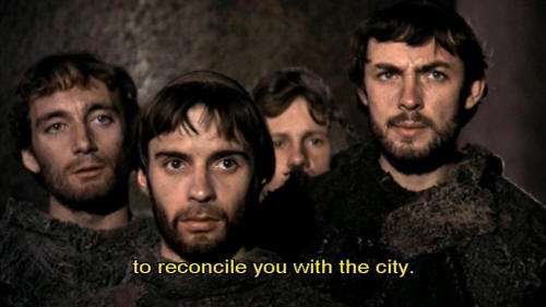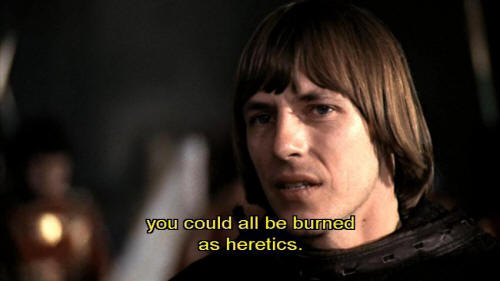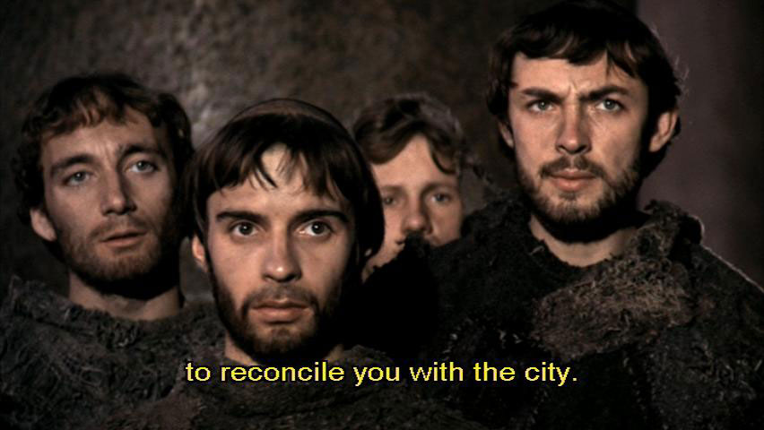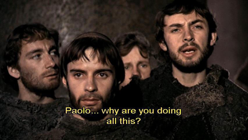 I will do everything in my power to reconcile you with the city. [Bernardo] Paolo, why are you doing all this? [Paolo] Because, in your simpleminded zeal, you could all be burned as heretics.