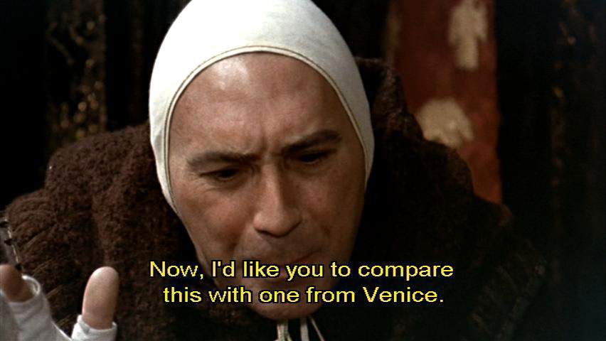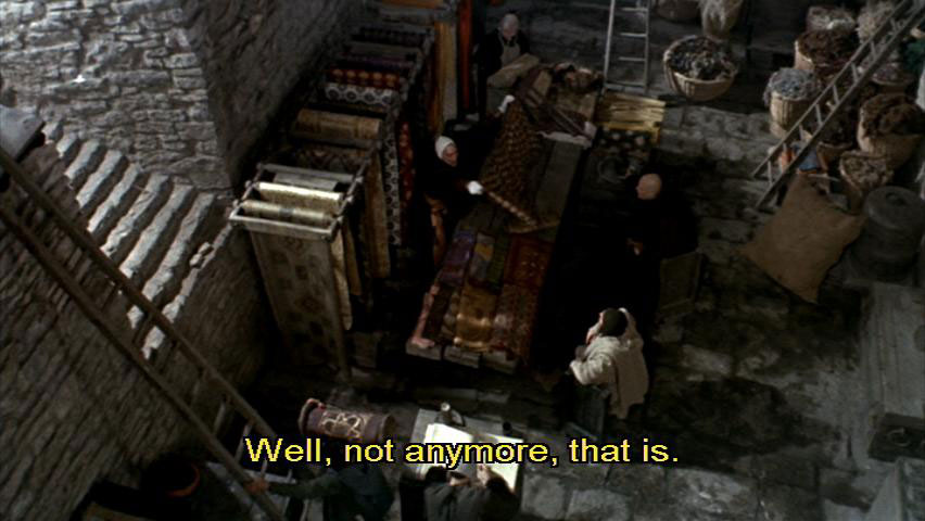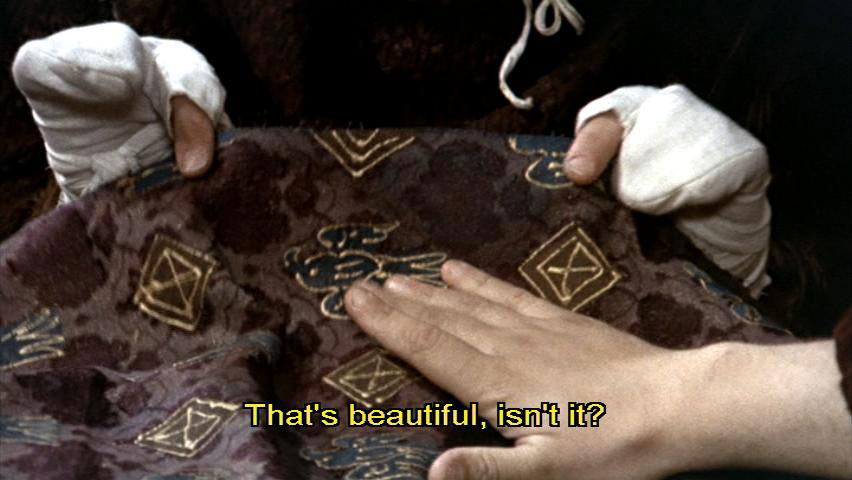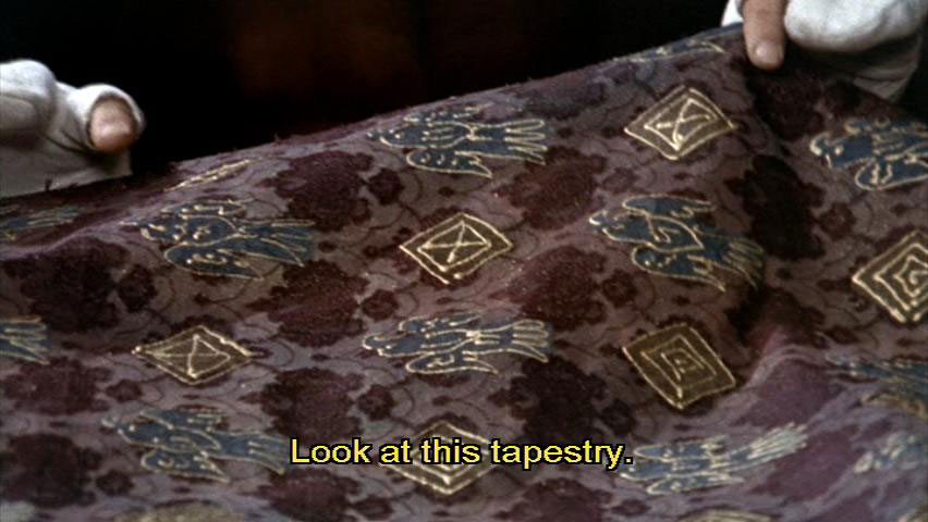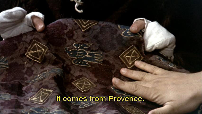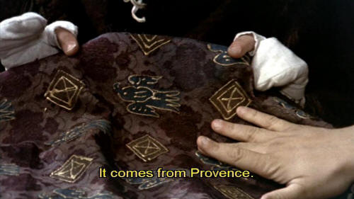 that you won't find anywhere but here. Well, not anymore, that is. Look at this tapestry. It comes from Provence. That's beautiful, isn't it? Feel the texture of this material. Now, I'd like you to compare this with one from Venice. Ah! This one here.