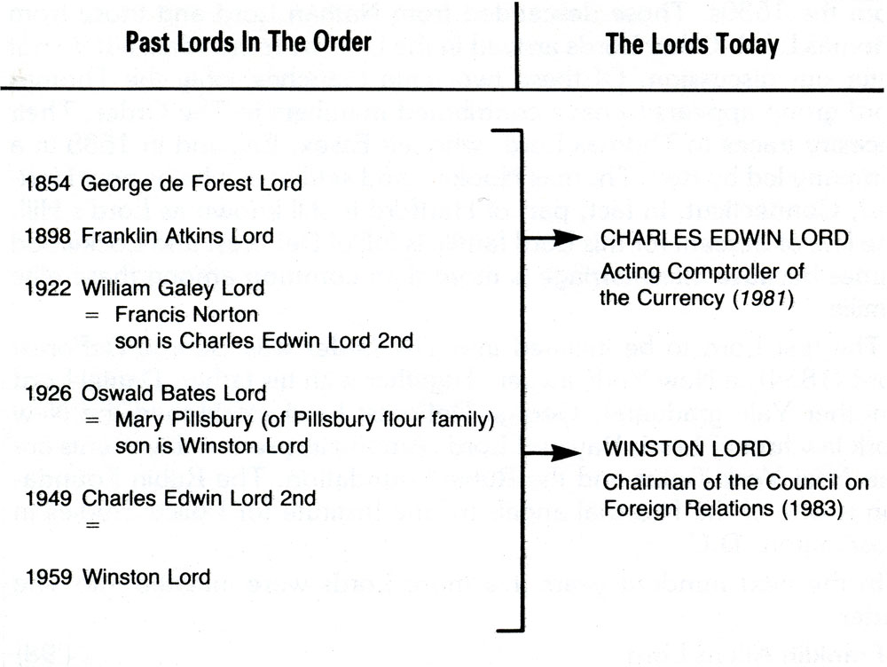 Inside The Order Entry into The Order is accompanied by an elaborate ritual and no doubt by psychological conditioning. For example: "Immediately on entering Bones the neophyte's name is changed. He is no longer known by his name as it appears in the college catalogue but like a monk or Knight of Malta or St. John, becomes Knight so and so. The old Knights are then known as Patriarch so and so. The outside world are known as Gentiles and vandals." The Catalogue (or membership list -- it became "Addresses" sometime in this century) of Chapter 322, however, is made with the usual "outside" names and is unique and impressive. Each member has a copy bound in black leather with peculiar symbols on the outside and inside. The symbols presumably have some meaning. The owner's name and the single letter "D" is gilt-stamped on the outer cover of earlier issues, at least up to the mid-19th century. It then appears to have been omitted, at least on copies we have seen: Each righthand page, printed one side only, about 6 x 4 inches, has the members listed for one year and surrounded by a heavy black border, thick in the early years, not so thick in recent decades. This symbolizes the death of the person named as he adopts his new name and new life upon entering The Order. Most interesting is an entry between the decade lists of members. On the 1833 list, before the 15 founders' names, are the words "Period 2 Decade 3." Similarly, before names on the 1843 list are the words "Period 2 Decade 4." In brief, "Period" stays the same throughout the years, but the "Decade" number increases by one in each ten years. No doubt this means something to The Order, else it wouldn't be there. Another mystical group of letters and numbers is at the top of the first list of names in 1833, "P.231-D.31." The numbers increase by one in each succeeding class. In 1834, for example, the entry reads "P.232-D 32." Furthermore, the first class list of 1833 has two blank lines in place of the eleventh name on the list. This supports the argument that the society has German origins and this is the listing of the anonymous German connection. The Members of 1833 We estimate that at any one time only about one-quarter of the membership is active. Even the active quarter is not always effective or successful. It's instructive to compare 1833 with 1983 and how, over the century and a half span, a group of 20-30 families has emerged to dominate The Order. The very first name on the very first membership list, Samuel Henshaw Bates, was a private in the Union Army, went west to farm in Santa Rosa, California, at that time very much in the boondocks, and died in 1879. A life not different to millions of other Americans. In fact, out of the first 15 members (actually 14 plus the anonymous member), achievements were not much greater than we would expect from the cream of a Yale "class". Rufus Hart spent several years in the Ohio Senate, Asahel Hooker Lewis was in the Ohio Legislature for a couple of years, Samuel Marshall was an Illinois State Legislator for a while, and Frederick Mather was in the New York Legislature. Other members, apart from the two founders of The Order, did nothing much with their lives or for The Order. By contrast, the two founding members, William Huntington Russell and Alphonso Taft, went far. William Russell was a member of the Connecticut State Legislature in 1846-47, a General in the Connecticut National Guard from 1862-70, and founded the Collegiate and Commercial Institute in New Haven, Connecticut. Alphonso Taft went further: he was Secretary of War in 1876 -- the first of several members of The Order to hold this post down into the 1950s. Taft became U.S. Attorney General in 1876-7, then U.S. Minister to Austria in 1882-4, and finally U.S. Ambassador to Russia in 1884-5. During the 150-year interval since 1833, active membership has evolved into a core group of perhaps 20-30 families; it seems that active members have enough influence to push their sons and relatives into The Order, and there is significant intermarriage among the families. These families fall into two major groups. First we find old line American families who arrived on the East coast in the 1600s, e.g., Whitney, Lord, Phelps, Wadsworth, Allen, Bundy, Adams and so on. Second, we find families who acquired wealth in the last 100 years, sent their sons to Yale and in time became almost old line families, e.g., Harriman, Rockefeller, Payne, Davison. Some families, like the Whitneys, were Connecticut Yankees and acquired wealth in the nineteenth century. In the last 150 years a few families in The Order have gained enormous influence in society and the world. One example is the Lord family. Two branches of this family date from the 1630s: Those descended from Nathan Lord and those from Thomas Lord. Other Lords arrived in the U.S. over the years but do not enter our discussion. Of these two main branches, only the Thomas Lord group appears to have contributed members to The Order. Their ancestry traces to Thomas Lord, who left Essex, England in 1635 in a company led by Rev. Thomas Hooker, and settled in what is now Hartford, Connecticut. In fact, part of Hartford is still known as Lord's Hill. The line of descent for this Lord family is full of DeForest and Lockwood names because intermarriage is more than common among these elite families. The first Lord to be initiated into The Order was George DeForest Lord (1854), a New York lawyer. Together with his father, Daniel Lord (another Yale graduate), George DeForest Lord established the New York law firm of Lord, Day and Lord. Among its present day clients are The New York Times and the Rubin Foundation. The Rubin Foundation is one of the financial angels for the Institute for Policy Studies in Washington, D.C. In the next hundred years five more Lords were initiated into The Order: Franklin Atkins