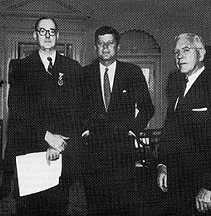 Richard Bissell, CIA Deputy Director for Plans, responsible for overseeing the disastrous Bay of Pigs invasion of Cuba in 1961, receives the National Security Medal from President Kennedy exactly one year later. A campaign of