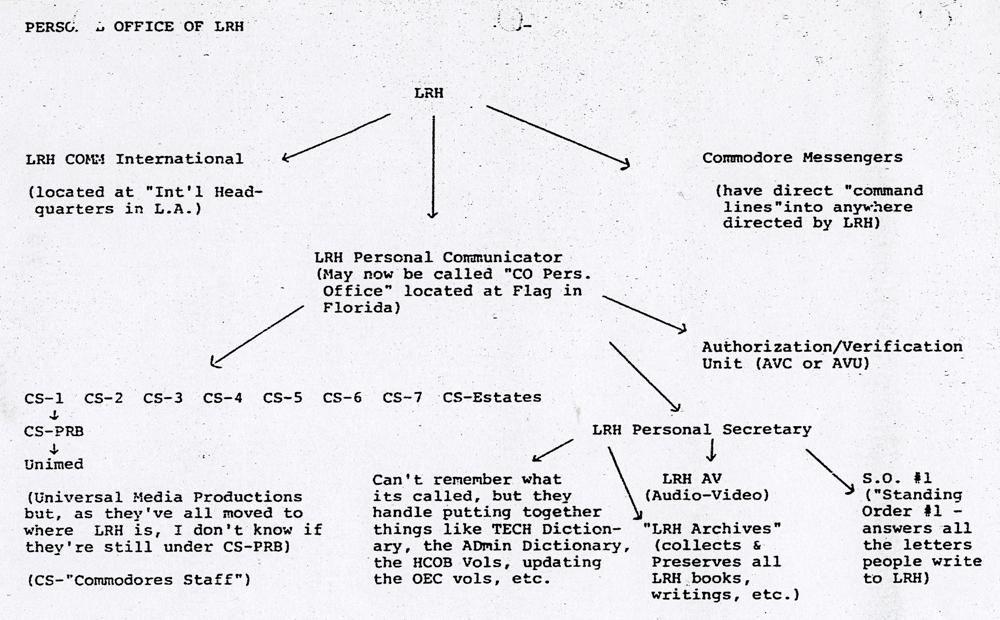These security checks supposedly would "bring out the R/Ses if they were correctly reported R/Ses in the beginning. The auditors I had doing the security checks had to first get "brushed up" on their R/Ses and get an O.K. from the Senior C/S (Case Supervisor) on Flag to do the sec checks. When someone would R/S on a "List One" item during the sec check, he or she would be sent to the Rehabilitation project Force. I must have seen 2 or 3 dozen people going to the RPF in a matter of weeks, because R/Ser's were SP's, and our superiors didn't want SP's running around, so SP' s were sent to the RPF to "get rehabilitated" Meanwhile, a "problem" arose on this project. Many people had no "reported R/S's " in their pc folders. This didn't mean that they weren't R/S-er's -- this just meant that none had yet come up. So, to handle this "problem" a new security check was created based on all the items on List One. I worked with LRH' s Tech Expeditor on this, and LRH approved a 250-300 question confessional which was called "The Classified confessional". This sec check was then given to people who didn't have R/S's in their folders; that way no one got missed -- everyone got one type of sec check or another. When I was sent. to the RPF, the "Classified confessional" had become part of the RPF program and I received it myself. In April or May, 1977, I was made the D/CO CMO CW because the D/CO was sent to where LRH was. I was still a fairly "new" messenger. Many other messengers had been with LRH for years. So, the CO CMO flew over to Clearwater to "back me up" and "establish me on post.". She worked with me for awhile and got me security clearance to go and work with LRH himself, in a training program, as a Messenger. I left for La Quinta, California. The first night. I was there, one of the Messengers took me over to LRH's office. LRH called it "rifle". I didn't talk to LRH that night since he was busy, but I saw him. He had long reddish-greyish hair down past his shoulders, rotting teeth, a really fat gut, and I believe at that time he had a full beard for "disguise". He didn't look anything like his pictures. The next day I met him. He was doing exercises in his courtyard, and called me over. I was nervous meeting him. I was really surprised that I didn't feel this "electric something or another" that I was told happens when you are around him. My life as a Messenger there was pretty much pure misery. When I first arrived, I had to get a security check, which everyone gets when they arrive. They asked questions like who you talked to on your way there, if you told anyone where you were going, etc. Well, something must have been registering on the E-Meter, because after I thought I was done with the sec check, I got taken back in for another one. I kept being asked over and over again what I was withholding, and I couldn't come up with anything. So the next day, I got taken back in for a security check from Mary Sue's personal auditor. That apparently handled it, because I wasn't taken back in anymore. Meanwhile, I was on "fulltime study". First, I had to do an orientation to where I was, and learn the "shore story". According to this story, we were to say we were guests on the ranch of some lawyer in LA who owned it. We all had aka's (also known as), which we had to learn. LRH's aka was Mr. Blake. The Messengers kept their first names, but our last names were changed slightly. This was so LRH wouldn't have to learn different names for us, since he was already accustomed to our real names. So when we were in town with him, he could just use our real first names. The last names were only slightly changed so that if we ever got caught in a lie, we could say that someone "misunderstood what we said our last name was" or something like that. Part of my training as a Messenger was "Messenger TR's". These included things like having a coach give you a whole string of orders and I'd have to repeat them back verbatim, and repeat them in the exact same tone as they were given. Messengers, when "running a Messenger for the Commodore" have to deliver the message or order verbatim, and have to do it in exactly the way Hubbard said it -- if he's mad at them, the Messengers just blast it, or if he's commanding someone, we'd have to give the message in that same tone of voice. I had to study "Messenger Logs". These are logs which the Messengers keep that are an hour-to-hour and minute-to-minute log of everything the Messengers do and everything LRH does. It includes waking up, taking a nap, yelling at a Messenger, visiting, reading and issuing telexes, eating, Messenger's washing his hair, giving him a back rub, etc. It's a daily log, kept every day, of everything he does and everything that happens. Part of my Messenger training program was to study and learn all of the medications LRH took. I know he took many medications, but I left before I was actually assigned to do it myself. The Messenger watch was designed so that there was always two Messengers on watch with LRH. In addition, there was a "Messenger Traffic Watch". This was one person who went through everything being sent to LRH. The Messenger on Traffic Watch would handle most things himself. On things that he knew LRH wanted to see himself, he'd send them straight in to LRH. On the rest, the Messenger would read the communication, and either reject it (if it didn't have enough data, or wasn't done well, etc.), or would handle it -- like approving a program proposal, or an issue. On ones he approved, he would type up a short summary of what it was and what he did with it, and send it in to LRH. This way LRH didn't have to read the whole thing -- he could just read the summary. There were two watches when 1 was there. One was from about 5 A.M. until 3 P.M. The second watch came on at 3 P.M., and though they were "off" whenever LRH went to bed (about 11 P.M. or midnight usually), they usually were there until 2 or 3 in the morning working on things he had