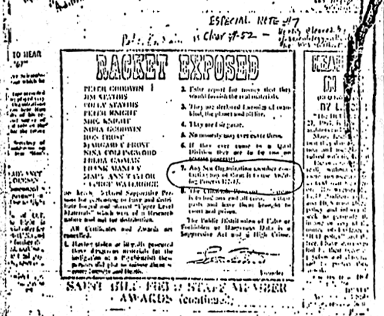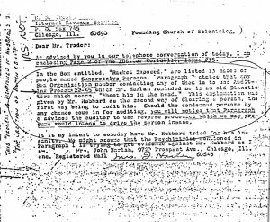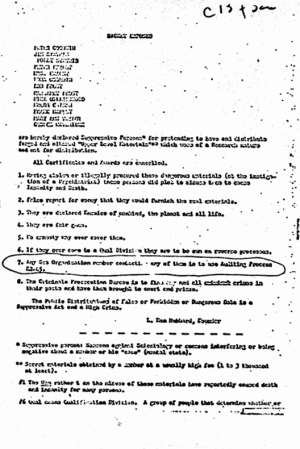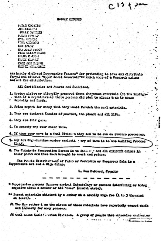 It is unknown to the authors of this Report whether the process was used on those individuals. During a meeting of Scientologists in Phoenix, Arizona, in 1954, Hubbard demonstrated the R2-45 auditing process by firing a shot into the floor during the middle of the meeting. There is some evidence to suggest that between 1975 and 1977, during the F.B.I. investigation of Scientology, meetings of Scientology executives were held in which there were discussions relative to auditing high level F.B.I. members with auditing process R2-45. U.S. Treasury Founding Church of Scientology Dear Mr. Trader: As advised by you in our telephone conversation of today, I am enclosing Page 2 of The Auditor Worldwide, Issue #35. In the Box entitled, "Racket Exposed," are listed 13 names of people named Suppressive Persons. Paragraph 7 states that any Sea Organization member contacting any of them is to use Auditing Process R2-45 which Mr. Harlan reminded me is an old Dianetic term which means, "Shoot him in the head." This explanation was given by Mr. Hubbard as the second way of Clearing a person, the first way being to audit him. Should the condemned persons by any chance come in for auditing, you will notice that Paragraph 6 advises the auditor to use reverse processes which we may presume would intend to drive the person insane. It is my intent to someday have Mr. Hubbard tried for his insanity. We might [illegible] that the Psychiatrist mentioned in Paragraph 1 is trying to get evidence against Mr. Hubbard as I am. Mrs. John Harlan, 9720 Prospect Ave., Chicago, Ill. cnc. Registered Mail Mrs. J. Harlan 60643 Handwritten note: This "process" is mentioned in Hubbard's Book "The Creation of Human Ability." RACKET EXPOSED [13 NAMES LISTED [ILLEGIBLE]] are hereby declared Suppressive Persons for pretending to have and distribute forged and altered "Upper Level [illegible]" which were of a Research [illegible] and not for distribution. All Certificates and Awards are cancelled. 1. Having stolen or illegally procured these dangerous materials (at the instigation of a Psychiatrist) these persons did plot to [illegible] them to cause Insanity and Death. 2. False report for [illegible] that they would furnish the real materials. 3. They are declared Enemies of [illegible], the planet and all life. 4. They are fair game. 5. No [illegible] may ever [illegible] them. 6. If they ever come to a Qual Division they are to be run on reverse processes. 7. Any Sea Organization member contacting any of them is to use Auditing Process R2-45. 8. The Criminale Prosecution [illegible] is to finally end all [illegible] crimes in their posts and have them brought to court and prison. The Public Distribution of Tales or Forbidden or Dangerous Data is a Suppressive Act and a High Crime. L. Ron Hubbard, Founder _______________ * Suppressive person: [Illegible] against Scientology or [illegible] interfering or being negative about a member or his [illegible] (mental state). ** Secret materials obtained by a member at a [illegible] high fee (1 to 3 thousand at least). #1 The Use rather than the [illegible] of those materials have reportedly caused death and insanity for many persons. #6 Qual means Qualification Division. A group of people that determine whether or ...