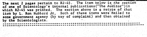 The next 2 pages pertain to R2-45. The item below is the section of one of Scientology's internal publications ("The Auditor") in which R2-45 was printed. The section above is a retype of that item by L. Ron Hubbard Jr. Both of these items were mailed to some government agency (by way of complaint) and then obtained by the Scientologists. -- City of Clearwater Commission Hearings Re: The Church of Scientology, Exhibit VIII