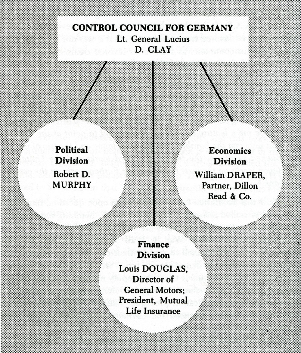 While this accusation is very much of an open question, requiring a great deal of skilled research into the U.S.A.A.F. bombing records, other aspects of favoritism for the Nazis are well recorded. At the end of World War II, Wall Street moved into Germany through the Control Council to protect their old cartel friends and limit the extent to which the denazification fervor would damage old business relationships. General Lucius Clay, the deputy military governor for Germany, appointed businessmen who opposed denazification to positions of control over the denazification proceeds. William H. Draper of Dill. on, Read, the firm which financed the German cartels back in the 1920s, became General Clay's deputy. Banker William Draper, as Brigadier General William Draper, put his control team together from businessmen who had represented American business in pre-war Germany. The General Motors representation included Louis Douglas, a former director of G.M., and Edward S. Zdunke, a pre-war head of General Motors in Antwerp, appointed to supervise the Engineering Section of the Control Council. Peter Hoglund, an expert on German auto industry, was given leave from General Motors. The personnel selection for the Council was undertaken by Colonel Graeme K. Howard — former G,M. representative in Germany and author of a book which "praises totalitarian practices [and] justifies German aggression .... "6 CONTROL COUNCIL FOR GERMANY Treasury Secretary Morgenthau was deeply disturbed at the implications of this Wall Street monopoly of the fate of Nazi Germany and prepared a memorandum to present to President Roosevelt. The complete Morgenthau memorandum, dated May 29, 1945, reads as follows: