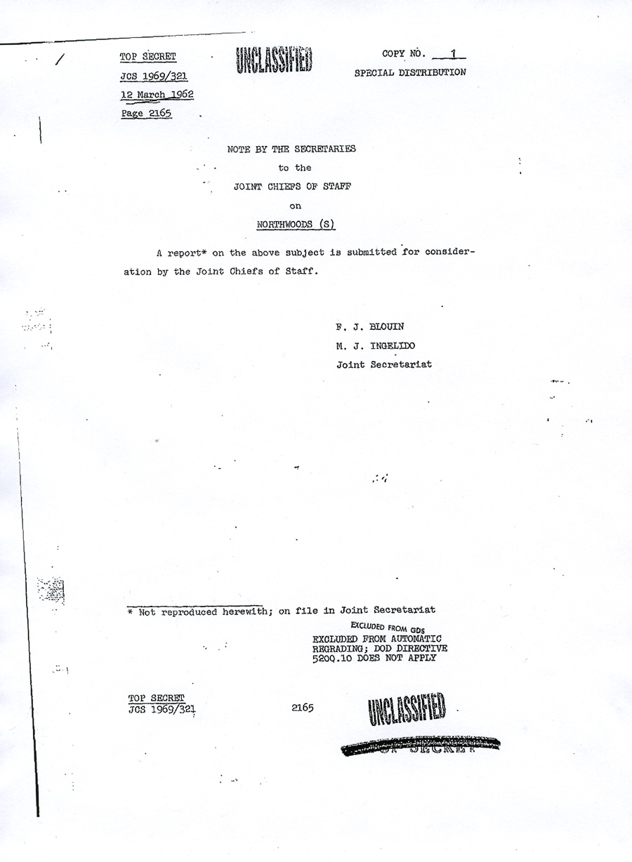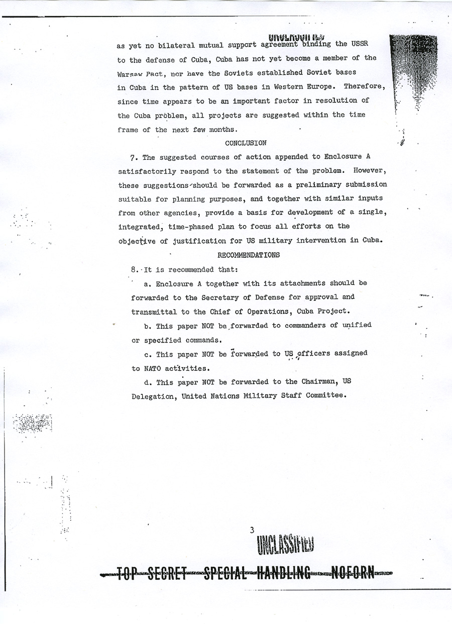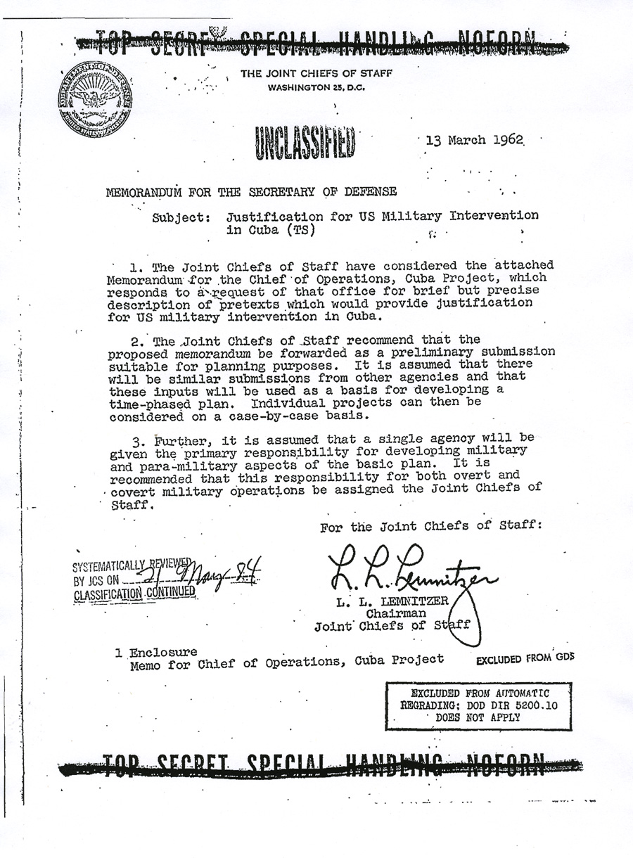 TOP SECRET SPECIAL HANDLING NOFORN THE JOINT CHIEFS OF STAFF UNCLASSIFIED MEMORANDUM FOR THE SECRETARY OF DEFENSE Subject: Justification for US Military Intervention in Cuba (TS) 1. The Joint Chiefs of Start have considered the attached Memorandum for the Chief of Operations, Cuba Project, which responds to a request of that office for brief but precise description of pretexts which would provide justification for US military intervention in Cuba. 2. The Joint Chiefs of Staff recommend that the proposed memorandum be forwarded as a preliminary submission suitable for planning purposes. It is assumed that there will be similar submissions from other agencies and that these inputs will be used as a basis for developing a time-phased plan. Individual projects can then be considered on a case-by-case basis. 3. Further, it is assumed that a single agency will be given the primary responsibility for developing military and para-military aspects of the basic plan. It is recommended that this responsibility for both overt and covert military operations be assigned the Joint Chiefs of Staff. For the Joint Chiefs of Staff: L.L. LEMNITZER SYSTEMATICALLY REVIEWED 1 Enclosure EXCLUDED FROM GDS EXCLUDED FROM AUTOMATIC TOP SECRET SPECIAL HANDLING NOFORN TOP SECRET UNCLASSIFIED COPY No. 1 NOTE BY THE SECRETARIES A report* on the above subject is submitted for consideration by the Joint Chiefs of Staff. F. J. BLOUIN ____________ * Not reproduced herewith; on file in Joint Secretariat EXCLUDED FROM GDS TOP SECRET TOP SECRET 9 March 1962
