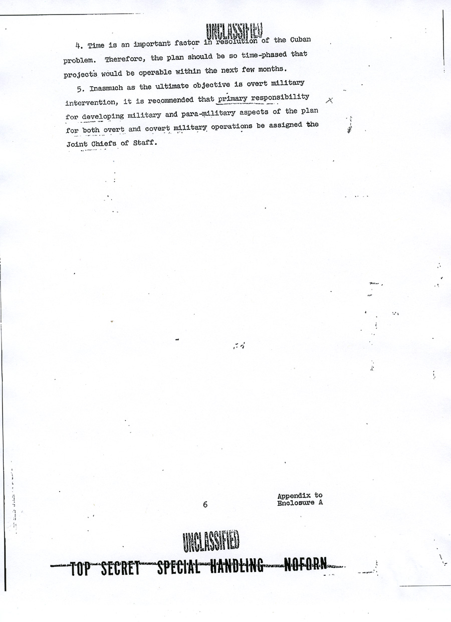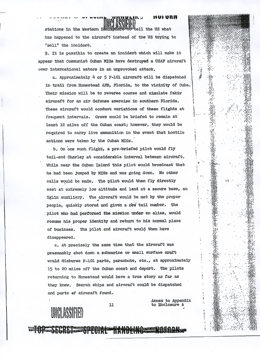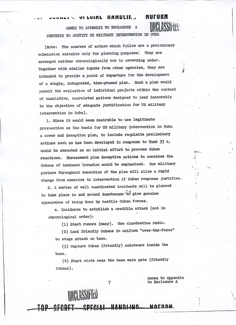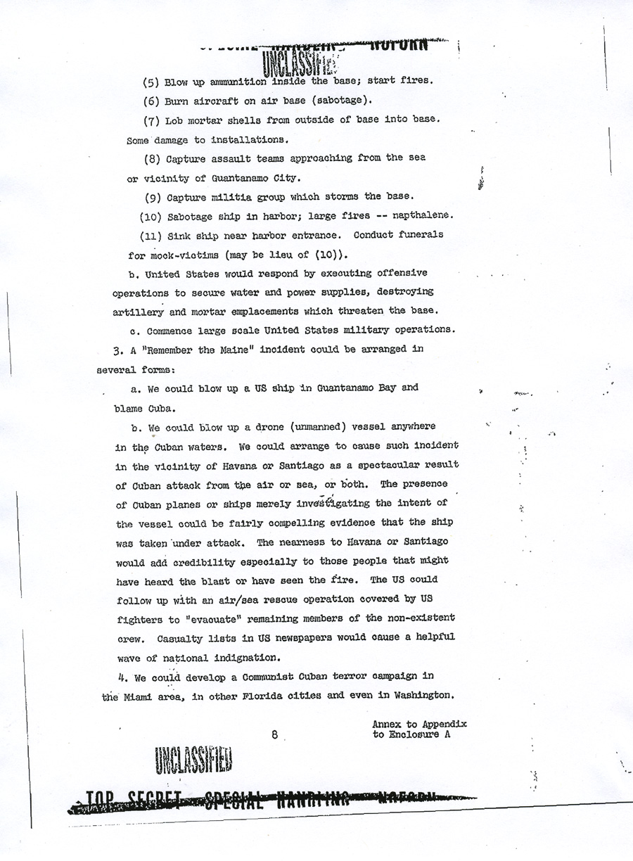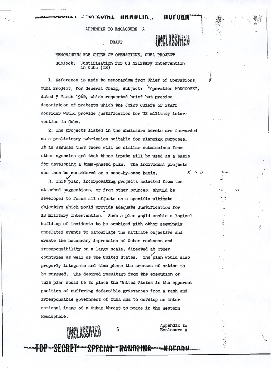 Chief of Operations, Cuba Enclosure A UNCLASSIFIED TOP SECRET SPECIAL HANDLING NOFORN APPENDIX TO ENCLOSURE A DRAFT MEMORANDUM FOR CHIEF OF OPERATIONS, CUBA PROJECT Subject: Justification for US Military Intervention in Cuba (TS) 1. Reference is made to memorandum from Chief of Operations, Cuba Project, for general Craig, Subject: "Operation MONGOOSE", dated 5 March 1962, which requested brief but precise description of pretexts which the Joint Chiefs of Staff consider would provide justification for US military intervention in Cuba. 2. The projects listed in the enclosure hereto are forwarded as a preliminary submission suitable for planning purposes. It is assumed that there will be similar submissions from other agencies and that these inputs will be used as a basis for developing a time-phased plan. The individual projects can then be considered on a case-by-case basis. 3. This plan, incorporating projects selected from the attached suggestions, or from other sources, should be developed to focus all efforts on a specific ultimate objective which would provide adequate justification for US military intervention. Such a plan would enable a logical build-up of incidents to be combined with other seemingly unrelated events to camouflage the ultimate objective and create the necessary impression of Cuban rashness and irresponsibility on a large scale, directed at other countries as well as the United States. The plan would also properly integrate and time phase the courses of action to be pursued. The desired resultant from the execution of this plan would be to place the United States in the apparent position of suffering defensible grievances from a rash and irresponsible government of Cuba and to develop an international image of a Cuban threat to peace in the Western Hemisphere. Appendix to UNCLASSIFIED TOP SECRET SPECIAL HANDLING NOFORN UNCLASSIFIED 4. Time is an important factor in resolution of the Cuban problem. Therefore, the plan should be so time-phased that projects would be operable within the next few months. 5. Inasmuch as the ultimate objective is overt military intervention, it is recommended that primary responsibility for developing military and para-military aspects of the plan for both overt and covert military operations be assigned the Joint Chiefs of Staff. Appendix to UNCLASSIFIED TOP SECRET SPECIAL HANDLING NOFORN ANNEX TO APPENDIX TO ENCLOSURE A PRETEXTS TO JUSTIFY US MILITARY INTERVENTION IN CUBA (Note: The courses of action which follow are a preliminary submission suitable only for planning purposes: They are arranged neither chronologically nor in ascending order. Together with similar inputs from other agencies, they are intended to provide a point of departure for the development of a single, integrated, time-phased plan. Such a plan would permit the evaluation of individual projects within the context of cumulative, correlated actions designed to lead inexorably to the objective of adequate justification for US military intervention in Cuba). 1. Since it would seem desirable to use legitimate provocation as the basis for US military intervention in Cuba, a cover and deception plan, to include requisite preliminary actions such as has been developed in response to Task 33 c, could be executed as an initial effort to provoke Cuban reactions. Harassment plus deceptive actions to convince the Cubans of imminent invasion would be emphasized. Our military posture throughout execution of the plan will allow a rapid change from exercise to intervention if Cuban response justifies. 2. A series of well coordinated incidents will be planned to take place in and around Guantanamo to give genuine appearance of being done by hostile Cuban forces. a. Incidents to establish a credible attack (not in chronological order): (1) Start rumors (many). Use clandestine radio. (2) Land friendly Cubans in uniform "over-the-fence" to stage attack on base. (3) Capture Cuban (friendly) saboteurs inside the base. (4) Start riots near the base main gate (friendly Cubans). Annex to Appendix UNCLASSIFIED TOP SECRET SPECIAL HANDLING NOFORN (5) Blow up ammunition inside the base; start fires. (6) Burn aircraft on air base ( sabotage). (7) Lob mortar shells from outside of base into base. Some damage to installations. (8) Capture assault teams approaching from the sea or vicinity of Guantanamo City. (9) Capture militia group which storms the base. (10) Sabotage ship in harbor; large fires -- napthalene. (11) Sink ship near harbor entrance. Conduct funerals for mock-victims (may be lieu of (10)). b. United States would respond by executing offensive operations to secure water and power supplies, destroying artillery and mortar emplacements which threaten the base . c. Commence large scale United States military operations. 3. A "Remember the Maine" incident could be arranged in several forms: a. We could blow up a US ship in Guantanamo Bay and blame Cuba . b. We could blow up a drone (unmanned) vessel anywhere in the Cuban waters. We could arrange to cause such incident in the vicinity of Havana or Santiago as a spectacular result of Cuban attack from the air or sea, or both. The presence of Cuban planes or ships merely investigating the intent of the vessel could be fairly compelling evidence that the ship was taken under attack. The nearness to Havana or Santiago would add credibility especially to those people that might have heard the blast or have seen the fire. The US could follow up with an air/sea rescue operation covered by US fighters to "evacuate" remaining members of the non-existent crew. Casualty lists in US newspapers would cause a helpful wave of national indignation. 4. We could develop a Communist Cuban terror campaign in the Miami area, in other Florida cities and even in Washington. Annex to Appendix UNCLASSIFIED TOP SECRET SPECIAL HANDLING NOFORN The terror campaign could be pointed at Cuban refugees seeking haven in the United States. We could sink a boatload or Cubans