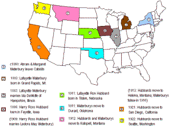 Chapter 1: A Dubious Prodigy According to the colourful yarn spun for the benefit of his followers, L. Ron Hubbard was descended on his mother's side from a French nobleman, one Count de Loupe, who took part in the Norman invasion of England in 1066; on his father's side, the Hubbards were English settlers who had arrived in America in the nineteenth century. It was altogether a distinguished naval family: both his maternal great-grandfather, 'Captain' I. C. DeWolfe, and his grandfather, 'Captain' Lafayette Waterbury, 'helped make American naval history',[1] while his father was 'Commander' Harry Ross Hubbard, US Navy. As his father was away at sea for lengthy periods, the story goes, little Ron grew up on his wealthy grandfather's enormous cattle ranch in Montana, said to cover a quarter of the state [approximately 35,000 square miles!]. His picturesque friends were frontiersmen, cowboys and an Indian medicine man. 'L. Ron Hubbard found the life of a young rancher very enjoyable. Long days were spent riding, breaking broncos, hunting coyote and taking his first steps as an explorer. For it was in Montana that he had his first encounter with another culture the Blackfoot [Pikuni] Indians. He became a blood brother of the Pikuni and was later to write about them in his first published novel, Buckskin Brigades. When he was ten years old, in 1921, he rejoined his family. His father, alarmed at his apparent lack of formal learning, immediately put him under intense instruction to make up for the time he had "lost" in the wilds of Montana. So it was that by the time he was twelve years old, L. Ron Hubbard had already read a goodly number of the world's greatest classics - and his interest in religion and philosophy was born. [2] *** Virtually none of this is true. The real story of L. Ron Hubbard's early life is considerably more prosaic and begins not on a cattle ranch but in a succession of rented apartments necessarily modest since his father was a struggling white-collar clerk drifting from job to job. His grandfather was neither a distinguished sea captain nor a wealthy rancher but a small-time veterinarian who supplemented his income renting out horses and buggies from a livery barn. It is true, however, that his name was Lafayette O. Waterbury. As far as anyone knew, the Waterburys came from the Catskills, the dark-forested mountain range in New York State celebrated in the early nineteenth century as the setting for Washington Irving's popular short story about Rip Van Winkle - a character only marginally more fantastic than the Waterburys' most famous scion. The Hubbards' and Waterburys' travels, 1860 to 1922.) Shortly before the turmoil of the Civil War divided the nation, Abram Waterbury and his young wife, Margaret, left the Catskills to join the thousands of hopeful settlers trekking west in covered wagons to seek a better future. By 1863 he had set up in business as a veterinarian in Grand Rapids, Michigan and on 25 July 1864, Margaret gave birth to a son whom they named Lafayette, perhaps after the town in Indiana at which they had stopped on their journey before turning north to Grand Rapids.