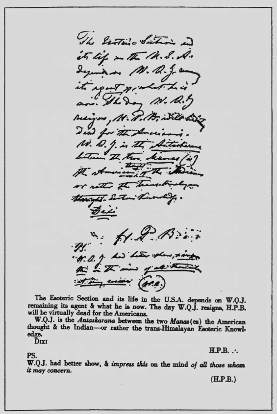 PS. W.Q.J. had better show, & impress this on the mind of all those whom it may concern. (H.P.B.) *** H.P. BLAVATSKY ON THE ESOTERIC SECTION "Having read your manifesto [dated Oct. 9, 1889 addressed to W.Q. Judge] herewith attached, permit me, before we part on the Esoteric field, you having placed yourself outside, and I, remaining within, to give you my impressions thereon. I must beg you to TRY to believe me when I say that they are expressed by one who, whatever you may say and do, knowing your inner nature better than you do yourself, has, and will go on having, the most sincerely fraternal and sympathetic feelings for you. To that Inner Mr. Bridge I say: 'I have the greatest esteem for your sincerity.' To the personal Mr. Bridge I proclaim:--- "'Beware, you have the PLEDGE-FEVER; but have no idea you have it.' You think all the feelings expressed in this manifesto are your own? One day you will find out that they were most insidiously grafted on your sensitive nature by the greatest enemies of Theosophy, of the T.S., and of my insignificant personality .... "'The hero-worship paid her' (H.P.B., or rather its idea, has originated with Dr. Elliot Coues, and has been canvassed vigorously by that person in the U.S.A ....Nor could any member of the Theosophical Society revolt [more] in his heart against 'hero-worship' than H.P.B. would on the day that she would find it in the heart of any Theosophist; which, so far, she has not .... "H.P.B. is not, nor ever was, the 'Theosophical Society'. But she is beyond doubt or cavil, the head of the E.S. of the T.S.; and if she drops it in the U.S.A. (she will never do so in England or India) then the Esoteric Section in that country would go with her. Only, carrying out the orders of the MASTER and MASTERS she is forced to go on even in the U.S. with the Esoteric teachings so long as there is one Esotericist FAITHFUL to his PLEDGE. And believe me dear Mr. Bridge, if 200 members were to follow your example and drop out of the E.S. a week later there would be 400 to replace them. For Truth must prevail, and there are as many earnest Esotericists, loyal to their Pledge to their Higher Self, and faithful to the Masters to death, who will therefore, do what any may, remain true to their old Teacher----the humble servant of the said MASTERS.". "...It is evident from your quotation of a paragraph in Olcott's editorial that he proclaims his most unqualified and unequivocal loyalty to, and recognition of, the MASTERS. And as you quote it with approbation, you evidently share this belief, so far at least, as to recognize in Them the real founders of the T.S. And if you do, what position do you take up with regard to their two humble servants? If you shout against Hero-Worship in my case, surely in justice you must do the same against Olcott in India, as he is a thousand times more reverenced and beloved in India than I ever was by anyone in the U.S.A. that I know of! One thing of two you have to choose. Either it is the Masters, or we two, who have founded the T.S. If the former, would They have chosen unworthy vehicles and Agents for the Exoteric work and the handing on of their precious heirloom of Wisdom and Science to Humanity? And if the latter, then the Theosophical Society is H.P.B. on the Esoteric plane, and H.S. Olcott and W.Q . Judge on the Exoteric plane. Thus you are condemned out of your own mouth to hold fast to your first proposition. And if you do, then it is your right duty to make the burden which presses on, already too heavily, the shoulders of the undersigned lighter, instead of heavier, by playing into the hands of such cruel, unscrupulous, and vindictive enemies of Theosophy as E.C. and M.C. "Think well, before you substitute for what you imagine to be 'Hero-Worship' the worship of SELF or personal prejudices, as embodied in your manifesto. Meanwhile, let us part for the present, Ever your Friend, "W.Q. Judge will put and lock in a safe the certificate of John Ransom Bridge, with the written remark 'resigned'. After such manifesto it is evident he cannot and shall not remain in the Esoteric Section. But this does not prevent, so far, his being an honest though a delirious man. Please notify Griggs. H.P.B. Letter dated late Oct. 1889 to John Ransom Bridge *** H.P. BLAVATSKY ON THE ESOTERIC SECTION "Bridge? Let him go to the devil & Noyes along with him, if he believes [1] in himself so much. My answer to his printed manifesto the copy of which I sent you will show you that I tell him plainly that it is all Pledge Fever & personality on his part.---Self-worship combating hero- worship for somebody else. He is an honest & sincere man, however, and I repeat so again. But he cannot believe in M.C.' s guilt & Baxter is behind his back. What do I mean by your playing into Lanes and Coues' hands? What I say. Coues will give half his wife's fortune to crush you, myself & Society. He tries to set us two at logger heads as Mrs. Ver Plank truly remarks. Let us defeat them (for Lane is Coues' creature) by remaining as united as the five fingers on one hand ...." H.P. Blavatsky _______________ Notes: 1. Following this, on the top of the second page of the second sheet of H.P.B.'s letter, written upside down, is the following:] "Master's last letter made me very miserable & I am hardly getting over it. Damn, my weakness for the fools!" *** H.P. BLAVATSKY ON THE ESOTERIC SECTION "In answer to your letter I can only say as follows: if W.Q. Judge, the man who has done most for Theosophy in America, who has worked most unselfishly in your country and has ever done the biddings of Master the best be knew how, is left alone in his righteous law-suit ...and if the Aryan Society in general and its Esotericists especially leave him alone, without their unanimous moral support, which is much more than their money, then I say, let them go! They are NO true Theosophists, because they care nothing for their honour, the honour and fair name of their Society. And