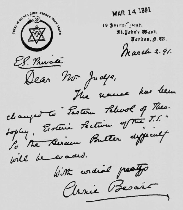 To Annie Besant, C.S. of the I.G. of the E.S. and R. of T. April 1, 1891 That it was resolved and recorded that the outer probationary degree should continue its existence and work with the material in hand, and that the 2nd and 7th clauses of the Pledge be altered as follows: 2. I pledge myself to support before the world the Theosophical movement, and in particular to answer and obey, without cavil or delay, all orders given me through the outer Heads of this School in all that concerns my Theosophical duties and Esoteric work, so far as I can do so without violating my positive obligations under the moral law and the laws of the land; and I expressly agree that I may be expelled from the School and that the fact of such expulsion may be made known to its members, should I violate this pledge of obedience and secrecy. 7. I pledge myself to preserve inviolable secrecy as regards the signs and passwords of the School and all confidential documents; and to return the latter to one of the outer Heads of the School, or their agents, in case of my resignation, or when requested by them to do so. That it was resolved that the said Annie Besant and William Q. Judge send notice to all members of the School, asking from them a declaration of allegiance to the School, and that they will reaffirm it in the new form above given. That until replies to the said notice are received no more of the Instructions, as revised before the departure of H.P.B., nor any of Instructions No, IV, ought to be sent out or delivered. That the names of all members who shall reply in the negative to said notice, and of all who shall fail to reply, shall be stricken off the list and a return of all their papers and documents of the School be required to be made to the said Annie Besant and William Q. Judge. That when all members shall have replied to said notice, those whose answers shall be in the affirmative shall receive Nos. I, II and III of the Instructions, as corrected and reprinted, if not already forwarded. That respecting No. IV of the Instructions, the same shall be sent under the rule laid down by H.P.B. before her departure, to-wit, to those whose answers to the Examination Paper No. I indicate a fitness to profit by them; and that in future, as discretion shall show, a new edition of said Examination Paper shall be sent out to those whose replies were not up to the standard at first, as well as to later members who may never have received the said paper, and whenever upon any new edition of said Examination Paper -- or any other sending out thereof -- the standard shall be reached by any member in his or her answers to the questions put, then in every such case the member shall be admitted to the Second Degree, and Instruction No. IV shall be sent as promised by H.P.B. before her departure. That applicants for admission to the School must show a knowledge of exoteric instructions so far given out, by answers to questions to be sent them. That the questions to candidates be sent out signed by Annie Besant and William Q. Judge. That the preliminary pledge be altered so as to include these questions among the documents not to be shown to anyone, and that the "Questions to Candidates" are to be returned with the answers thereto. That having read the address drawn up by Annie Besant and William Q. Judge, we put on record our full accord with it. That this Council records its decision that its appointment was solely for the purpose of assisting H.P.B. in a consultative way, and that as she had full power and authority to relieve us from duty at any time, our office and that of each of us ends with the above resolution passed in order as far as possible in our power to place the future conduct of the School on the basis directed and intended by her; therefore we collectively and individually declare that our Office as Councillors ceases at this date, and that from henceforth with Annie Besant and William Q. Judge rest the full charge and management of this School. (Signed.) ANNIE BESANT, Councillor E. S. T. WILLIAM Q. JUDGE, for the entire American Council E.S.T., and individually. *** STRICTLY PRIVATE AND CONFIDENTIAL EASTERN SCHOOL OF THEOSOPHY. Address: ANNIE BESANT, American Address: All Communications relative to this School must be marked "Private," and must contain no other business. LONDON, May 27, 1891. BROTHERS AND SISTERS: The departure of our Teacher, H.P.B., renders necessary certain changes in the Constitution of this School, and a notice of these accompanies the present address. But in addition to these changes, made by the joint Councils of the E.S.T., it is our duty, as the two selected by H.P.B. as her agents and representatives after her departure, to specially speak to each one of you respecting the duty laid on the School by her retirement from the visible control of its affairs. The future of this body depends on the way in which this test of steadfastness and loyalty is endured by the members collectively and individually. If they fall, the School will perish and the life-work of H.P.B's last incarnation will be a failure: if they stand, the Blessing of the Masters will rest on the School, will secure its stability, and will prosper the efforts of the members for the good of the exoteric Society. More than ever does it now become our duty to devote ourselves to the body at large. The knowledge we have acquired, and shall continue to acquire, we hold in trust for the service of the Society; it will ill become her pupils if they desert the great Cause to which her life was given, and invite the terrible Karma that must fall on those who break the solemn pledge that each of us has made. The School is the heart of the Society: if the heart ceases to throb, the Society must die, as a living power, and slowly decay while passing into a mere sect. We call you then to a fuller and more earnest carrying out of your pledge than you have ever yet attempted; the greatness of the need should be the meas