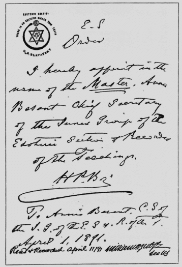 The Council passed the following minute: In virtue of our appointment by H.P.B., we declare: That in full accord with the known wishes of H.P.B., the visible Head of the School, we primarily resolve and declare that the work of the School ought and shall be continued and carried on along the lines laid down by her, and with the matter left in writing or dictated by her before her departure. That it was recorded that there was ample proof by witnesses, members of this School, that her last words In reference to the School and its work were: "KEEP THE LINK UNBROKEN! DO NOT LET MY LAST INCARNATION BE A FAILURE." That her words to Bro. Judge in a recent letter were read stating that this Section (now School) is the "throbbing heart of the Theosophical Society." That it was resolved and recorded that the highest officials in the School for the present are Annie Besant and William Q. Judge, in accordance with the above-quoted order to William Q. Judge of December, 1888, and with the order of April 1, 1891, to Annie Besant, as well as with the written declaration of H.P.B. in a letter to William Q. Judge dated March 27, 1891, which we now here have read, in which she wrote that Annie Besant should be so considered. The order of April 1, 1891, is as follows: [COPY.) E.S. -- ORDER. I hereby appoint, in the name of the MASTER, Annie Besant Chief Secretary of the Inner Group of the Esoteric Section and Recorder of the Teachings. H. P. B.