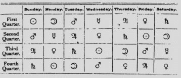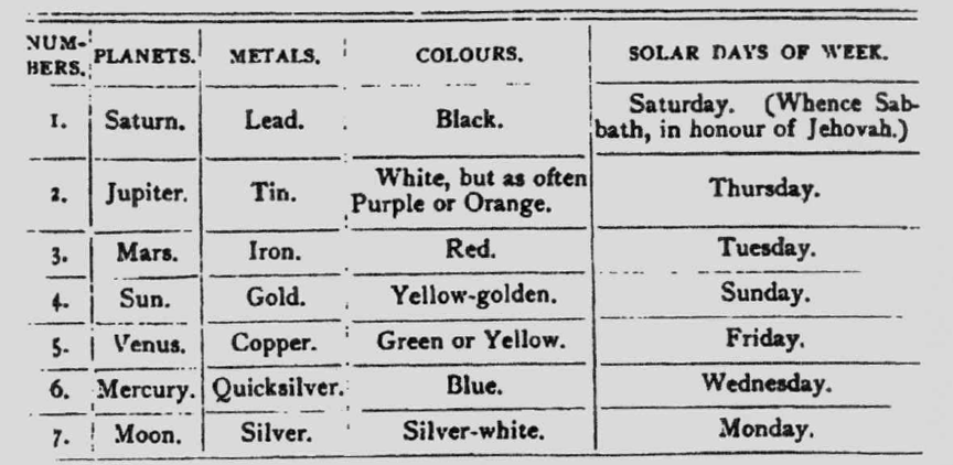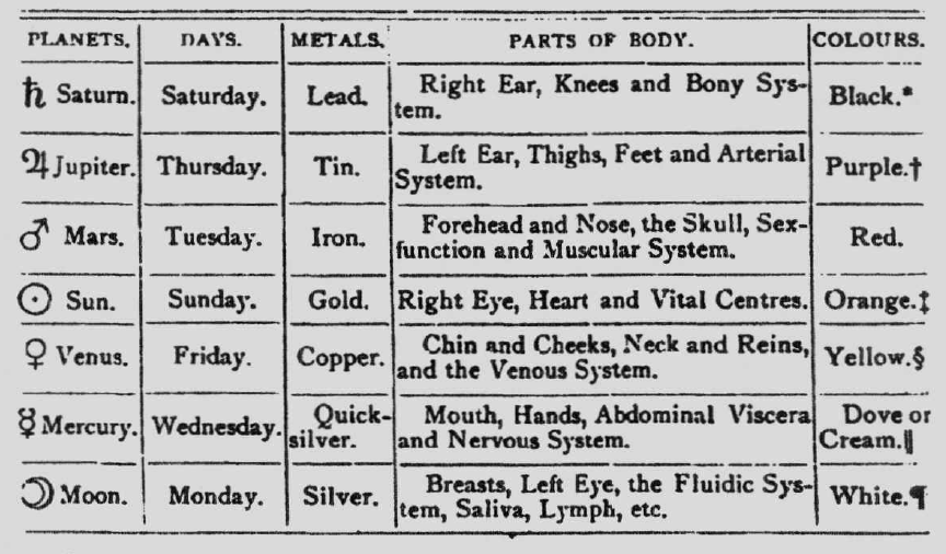 Thus it will be seen that the influence of the solar system in the exoteric Kabalistic Astrology is by this method distributed over the entire human body, the primary metals, and the gradations of colour from black to white; but that Esotericism recognizes neither black nor white as colours, because it holds religiously to the seven solar or natural colours of the prism. Black and white are artificial tints. They belong to the Earth, and are only perceived by virtue of the special construction of our physical organs. White is the absence of all colours, and therefore no colour; black is simply the absence of light, and therefore the negative aspect of white. The seven prismatic colours are direct emanations from the Seven Hierarchies of Being, each of which has a direct bearing upon and relation to one of the human principles, since each of these Hierarchies is, in fact, the creator and source of the corresponding human principle. Each prismatic colour is called in Occultism the "Father of the Sound" which corresponds to it; sound being the Word, or the Logos, of its Father-Thought. This is the reason why sensitives connect every colour with a definite sound, a fact well recognized in modern science, (e.g., Francis Galton's Nature and Nurture). But black and white are entirely negative colours, and have no representatives in the world of subjective being. Kabalistic Astrology says that the dominion of the planetary bodies in the human brain also is defined thus: there are seven primary groups of faculties, six of which function through the cerebrum, and the seventh through the cerebellum. This is perfectly correct esoterically. But when it is further said that: Saturn governs the devotional faculties; Mercury, the intellectual; Jupiter, the sympathetic; the Sun, the governing faculties; Mars, the selfish; Venus, the tenacious; and the Moon, the instincts; -- we say that the explanation is incomplete and even misleading. For, in the first place, the physical planets can rule only the physical body and the purely physical functions. All the mental, emotional, psychic and spiritual faculties are influenced by the occult properties of the scale of causes which emanate from the Hierarchies of the Spiritual Rulers of the planets, and not by the planets themselves. This scale, as given in Diagram II, leads the student to perceive in the following order: (1) colour; (2) sound; (3) the sound materializes into the spirit of the metals, i. e., the metallic Elementals; (4) these materialize again into the physical metals; (5) then the harmonial and vibratory radiant essence passes into the plants, giving them colour and smell, both of which "properties" depend upon the rate of vibration of this energy per unit of time; (6) from plants it passes into the animals; (7) and finally culminates in the "principles" of man. Thus we see the divine essence of our Progenitors in heaven circling through seven stages; spirit becoming matter, and matter returning to spirit. As there is sound in nature which is inaudible, so there is colour which is invisible, but which can be heard. The creative force, at work in its incessant task of transformation, produces colour, sound and numbers, in the shape of rates of vibration which compound and dissociate the atoms and molecules. Though invisible and inaudible to us in detail, yet the synthesis of the whole becomes audible to us on the material plane. It is that which the Chinese call the "Great Tone," or Kung. It is, even by scientific confession, the actual tonic of nature, held by musicians to be the middle Fa on the keyboard of a piano. We hear it distinctly in the voice of nature, in the roaring of the ocean, in the sound of the foliage of a great forest, in the distant roar of a great city; in the wind, the tempest and the storm: in short, in everything in nature which has a voice or produces sound. To the hearing of all who hearken, it culminates in a single definite tone, of an unappreciable pitch, which, as said, is the F, or Fa, of the diatonic scale. From these particulars, that wherein lies the difference between the exoteric and the esoteric nomenclature and symbolism will be evident to the student of Occultism. In short, Kabalistic Astrology, as practised in Europe, is the semi-esoteric secret science, adapted for the outer and not for the inner circle. It is, furthermore, often left incomplete and not infrequently distorted to conceal the real truth. While it symbolizes and adopts its correspondences on the mere appearances of things, esoteric philosophy, which concerns itself preeminently with the essence of things, accepts only such symbols as cover the whole ground, i.e., such symbols as yield a spiritual as well as a psychic and physical meaning. Yet even Western Astrology has done excellent work, for it has helped to carry the knowledge of the existence of a Secret Wisdom throughout the dangers of the Mediaeval Ages and their dark bigotry up to the present day, when all danger has disappeared. The order of the planets in exoteric practice is that defined by their geocentric radii, or the distance of their several orbits from the Earth as a centre, viz: Saturn, Jupiter, Mars, Sun, Venus, Mercury and Moon. In the first three of these we find symbolized the celestial triad of supreme power in the physical, manifested universe, or Brahma, Vishnu and Siva; while in the last four we recognize the symbols of the terrestrial quaternary ruling over all natural and physical revolutions of the seasons, quarters of the day, points the compass, and elements. Thus: