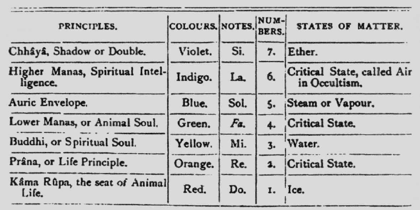 Here again the student is asked to dismiss from his mind any correspondence between "principles" and numbers, for reasons already given. The esoteric enumeration cannot be made to correspond with the conventional exoteric. The one is the reality, the other classified according to illusive appearances. The human principles, as given in Esoteric Buddhism, were tabulated for beginners, so as not to confuse their minds. It was half a blind. To proceed:
