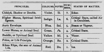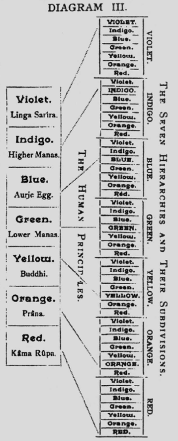 PLATE III. NOTE (a). -- The numbers attached to the circles are for purposes of reference only. They have no correspondence with colours or principles. NOTE (b). -- Each of the prismatic circles corresponds to, and is the source of, the principle corresponding in colour to its widest circle; e.g., circle 1 corresponds to the Linga Sarira (Violet). A good clairvoyant, moreover, if he had an opportunity of seeing a Yogi in the trance state and a mesmerized subject, side by side, would learn an important lesson in Occultism. He would learn to know the difference between self-induced trance and a hypnotic state resulting from extraneous influence. In the Yogi, the "principles" of the lower Quaternary disappear entirely. Neither Red, Green, Red-Violet nor the Auric Blue of the Body are to be seen; nothing but hardly perceptible vibrations of the golden-hued Prana principle and a violet flame streaked with gold rushing upwards from the head, in the region where the Third Eye rests, and culminating in a point. If the student remembers that the true Violet, or the extreme end of the spectrum, is no compound colour of Red and Blue, but a homogeneous colour with vibrations seven times more rapid than those of the extreme Red, [*] and that the golden hue is the essence of the three yellow hues from Orange Red to Yellow-Orange and Yellow, he will understand the reason why: he lives in his own Auric Body, now become the vehicle of Buddhi-Manas. On the other hand, in a subject in an artificially produced hypnotic or mesmeric trance, an effect of unconscious when not of conscious Black Magic, unless produced by a high Adept, the whole set of the principles will be present, with the Higher Manas paralysed, Buddhi severed from it through that paralysis, and the red-violet Astral Body entirely subjected to the Lower Manas and Kama Rupa (the green and red animal monsters in us). One who comprehends well the above explanations will readily see how important it is for every student, whether he is striving for practical occult powers or only for the purely psychic and spiritual gifts of clairvoyance and metaphysical knowledge, to master thoroughly the right correspondences between the human, or nature principles, and those of Kosmos. It is ignorance which leads materialistic science to deny the inner man and his divine powers; knowledge and personal experience that allow the Occultist to affirm that such powers are as natural to man as swimming to fishes. It is like a Laplander, in all sincerity, denying the possibility of the catgut, strung loosely on the sounding-board of a violin, producing comprehensive sounds or melody. Our principles are the Seven-Stringed Lyre of Apollo, truly. In this our age, when oblivion has shrouded ancient knowledge, men's faculties are no better than the loose strings of the violin to the Laplander. But the Occultist who knows how to tighten them and tune his violin in harmony with the vibrations of colour and sound, will extract divine harmony from them. The combination of these powers and the attuning of the Microcosm and the Macrocosm will give the geometrical equivalent of the invocation "Om Mani Padme Hum." This was why the previous knowledge of music and geometry was obligatory in the school of Pythagoras. ---------- The Roots of Colour and Sound. PLATE III. Further, each of the Primordial Seven, the first Seven Rays forming the Manifested Logos, is again sevenfold. Thus, as the seven colours of the solar spectrum correspond to the seven Rays, or Hierarchies, so each of these latter has again its seven divisions corresponding to the same series of colours. But in this case one colour, viz: that which characterizes the particular Hierarchy as a whole, is predominant and more intense than the others. These Hierarchies can only be symbolized as concentric circles of prismatic colours; each Hierarchy being represented by a series of seven concentric circles, each circle representing one of the prismatic colours in their natural order. But in each of these "wheels" one circle will be brighter and more vivid in colour than the rest and the wheel will have a surrounding Aura (a fringe, as the physicists call it) of that colour. This colour will be the characteristic colour of that Hierarchy as a whole. Each of these Hierarchies furnishes the essence (the soul) and is the "Builder" of one of the seven kingdoms of Nature, which are the three elemental kingdoms, the mineral, the vegetable, the animal, and the kingdom of spiritual man. [34] Moreover, each Hierarchy furnishes the aura of one of the seven principles in man with its specific colour. Further, as each of these Hierarchies is the Ruler of one of the Sacred Planets, it will easily be understood how Astrology came into existence, and that real Astrology has a strictly scientific basis. Plate III demonstrates the fact by showing the symbol adopted in the Eastern school to represent the Seven Hierarchies of creative Powers; call them Angels, if you will, or Planetary Spirits, or, again, the Seven Rulers of the Seven Sacred Planets of our system, as in our present case. At all events, the concentric circles stand as symbols for Ezekiel's "Wheels" with some Western Occultists and Kabalists, and for the "Builders" or Prajapati with us. DIAGRAM III. The student should carefully examine the following Diagram. Thus the Linga Sarira is derived from the Violet sub-ray of the Violet Hierarchy; the Higher Manas is similarly derived from the Indigo sub-ray of the Indigo Hierarchy, and so on. Every man being born under a certain planet, there will always be a predominance of that planet's colour in him, because that "principle" will rule in him which has its origin in the Hierarchy in question. There will also be a certain amount of the colour derived from the other planets present in his Aura, but that of the ruling planet will be strongest. Now a person in whom say, the Mercury principle is predominant, will, by acting upon the Mercury 