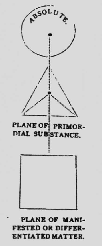 Even in the evolution of the Races we see the same order as in nature and man. [5] Placental animal-man became such only after the separation of sexes in the Third Root-Race. In the physiological evolution, the placenta is fully formed and functional only after the third month of uterine life. ---------- Let us put aside such human conceptions as a personal God, and hold to the purely divine, to that which underlies all and everything in boundless Nature. It is called by its Sanskrit esoteric name in the Vedas, TAT (or THAT), a term for the unknowable Rootless Root. If we do so, we may answer these seven questions of the Esoteric Catechism thus: (1) Q. -- What is the Eternal Absolute? A. -- THAT. (2) Q. -- How came Kosmos into being? A. -- Through THAT. (3) Q. -- How, or what will it be when it falls back into Pralaya? A. -- In THAT. (4) Q. -- Whence all the animate, and suppositionally, the "inanimate" nature? A. -- From THAT. (5) Q. -- What is the Substance and Essence of which the Universe is formed? A. --THAT. (6) Q. -- Into what has it been and will be again and again resolved?' A. -- Into THAT. (7) Q. -- Is THAT then both the instrumental and material cause of the Universe? A. -- What else is it or can it be than THAT? As the Universe, the Macrocosm and the Microcosm, [6] are ten, why should we divide Man into seven "principles"? This is the reason why the perfect number ten is divided into two, a reason which cannot be given out publicly: In their completeness, i.e., super-spiritually and physically, the forces are TEN: to-wit, three on the subjective and inconceivable, and seven on the objective plane. Bear in mind that I am now giving you the description of the two opposite poles: (4) the primordial triangle, which, as soon as it has reflected itself in the "Heavenly Man," the highest of the lower seven -- disappears, returning into "Silence and Darkness"; and (b) the astral paradigmatic man, whose Monad (Atma) is also represented by a triangle, as it has to become a ternary in conscious Devachanic interludes. The purely terrestrial man being reflected in the universe of matter, so to say, upside down, the upper triangle, wherein the creative ideation and the subjective potentiality of the formative faculty resides, is shifted in the man of clay below the seven. Thus three of the ten, containing in the archetypal world only ideative and paradigmatic potentiality, i.e., existing in possibility, not in action, are in fact one. The potency of formative creation resides in the Logos, the synthesis of the seven Forces or Rays, which becomes forthwith the Quaternary, the sacred Tetraktys. This process is repeated in man, in whom the lower physical Triangle becomes, in conjunction with the female One, the male-female creator, or generator. The same on a still lower plane in the animal world. A mystery above, a mystery below, truly. This is how the upper and highest, and the lower and most animal, stand in mutual relation. DIAGRAM I. In this diagram, we see that physical man (or his body) does not share in the direct pure wave of the divine Essence which flows from the One in Three, the Unmanifested, through the Manifested Logos (the upper face in the diagram). Purusha, the primeval Spirit, touches the human head and stops there. But the Spiritual Man (the synthesis of the seven principles) is directly connected with it. And here a few words ought to be said about the usual exoteric enumeration of the principles. As those not pledged could hardly be entrusted with the whole truth, an approximate division only was made and given out. Esoteric Buddhism, begins with Atma, the seventh, and ends with the Physical Body, the first. Now, neither Atma, which is no individual "principle," but a radiation from and one with the Unmanifested Logos; nor the Body, which is the material rind, or shell, of the Spiritual Man, can be, in strict truth, referred to as "principles." Moreover, the chief "principle" of all, one not even mentioned heretofore, is the "Luminous Egg" (Hiranyagarbha), or the invisible magnetic sphere in which every man is enveloped. [7] It is the direct emanation: (a) from the Atmic Ray in its triple aspect of Creator, Preserver and Destroyer (Regenerator); and (b) from Buddhi-Manas. The seventh aspect of this individual aura is the faculty of assuming the form of its body and becoming the "Radiant," the Luminous Augoeides. It is this, strictly speaking, which at times becomes the form called Mayavi Rupa. Therefore, as explained on the second face of the diagram (the astral man), the Spiritual Man consists of only five principles, as taught by the Vedantins, [8] who substitute, tacitly, for the physical, this sixth, or Auric, Body, and merge the dual Manas (the dual mind, or consciousness) into one. Thus they speak of five Koshas (sheaths, or principles), and call Atma the sixth yet no "principle." This is the secret of the late Subba Row's criticism of the division in Esoteric Buddhism. But let the student now learn the true esoteric enumeration. PLATE 1. The reason why public mention of the Auric Body is not permitted is on account of its being so sacred. It is this Body which, at death, assimilates the essence of Buddhi and Manas and becomes the vehicle of these spiritual principles, which are not objective, and then, with the full radiation of Atma upon it, ascends as Manas-Taijasi into the Devachanic state. Therefore is it called by many names. It is the Sutratma, the silver "thread" which "incarnates" from the beginning of Manvantara to the end, stringing upon itself the pearls of human existence, in other words, the spiritual aroma of every personality it follows through the pilgrimage of life. [9] It is also the material from which the Adept forms his Astral Bodies, from the Augoeides and the Mayavi Rupa downwards. After the death of man, when its most ethereal particles have drawn into themselves the spiritual principles of Buddhi and the Upper Manas, and are illuminated w