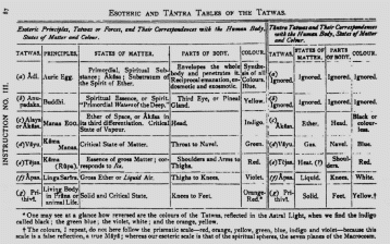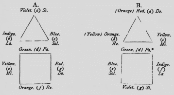 INSTRUCTION NO. II A. Violet. (a) Si. B. (Orange) Red. (a) Do. A. (a) The Astral Double of Nature, or the Paradigm of all Forms. (b) Divine Ideation, or Universal Mind. (c) The Synthesis of occult Nature, the Egg of Brahma, containing all and radiating all. (d) Animal or Material Soul of Nature, source of animal and vegetable intelligence and instinct. (e) The aggregate of Dhyan Chohanic Intelligences, Fohat. (f) Life Principle in Nature. (g) The Life Procreating Principle in Nature. That which, on the spiritual plane, corresponds to sexual affinity on the lower. Mirrored on the plane of Gross Nature, the World of Reality is reversed, and becomes on Earth and our plane: B. (a) Red is the colour of manifested dual, or male and female. In man it is shown in its lowest animal form. (b) Orange is the colour of the robes of the Yogis and Buddhist priests, the colour of the Sun and Spiritual Vitality, also of the Vital Principle. (c) Yellow or radiant Golden is the colour of the Spiritual, Divine Ray in every atom; in man of Buddhi. (d) Green and Red are, so to speak, interchangeable colours, for Green absorbs the Red, as being threefold stronger in its vibrations than the latter; and Green is the complementary colour of extreme Red. This is why the Lower Manas and Kama Rupa are respectively shown as Green and Red. (e) The Astral Plane, or Auric Envelope in Nature and Man. (f) The Mind or rational element in Man and Nature. (g) The most ethereal counterpart of the Body of man, the opposite pole, standing in point of vibration and sensitiveness as the Violet stands to the Red. PLATE II. The above is on the manifested plane; after which we get the seven and the Manifested Prism, or Man on Earth. With the latter, the Black Magician alone is concerned. In Kosmos, the gradations and correlations of Colours and Sounds, and therefore of Numbers, are infinite. This is suspected even in Physics, for it is ascertained that there exist slower vibrations than those of the Red, the slowest perceptible to us, and far more rapid vibrations than those of the Violet, the most rapid that our senses can perceive. But on Earth, in our physical world, the range of perceptible vibrations is limited. Our physical senses cannot take cognizance of vibrations above and below the septenary and limited gradations of the prismatic colours, for such vibrations are incapable of causing in us the sensation of colour or sound. It will always be the graduated septenary and no more, unless we learn to paralyze our Quaternary and discern both the superior and inferior vibrations with our spiritual senses seated in the upper Triangle. Now, on this plane of illusion, there are three fundamental colours, as demonstrated by physical Science: Red, Blue, and Yellow, (or rather Orange-Yellow). Expressed in terms of the human principles they are: (1) Kama Rupa, the seat of the animal sensations, welded to, and serving as a vehicle for the Animal Soul or Lower Manas (Red and Green, as said, being interchangeable); (2) Auric Envelope, or the essence of man; and (3) Prana, or Life Principle. But if from the realm of illusion, or the living man as he is on our Earth, subject to his sensuous perceptions only, we pass to that of semi-illusion, and observe the natural colours themselves, or those of the principles, that is, if we try to find out which are those that in the perfect man absorb all others, we shall find that the colours correspond and become complementary in the following way:
