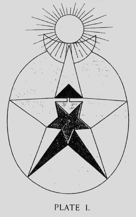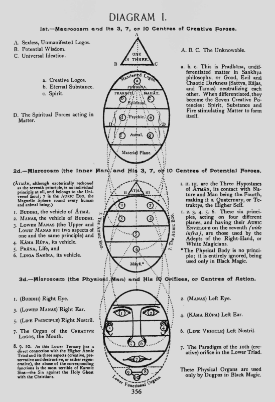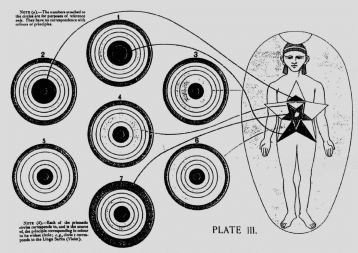 Ragon. *** 1. Embryo. 2. Amniotic Fluid (Liquor Amnii) in which the Embryo floats. 3. Amnion, a foetal membrane surrounding the Embryo, and containing the Amniotic Fluid. 4. Umbilical Vesicle, or Yolk Sac, containing the Yolk, the source of nutrition to the early Embryo. 5. Allantois, a vesicle proceeding from the extremity of the Embryo, spreading itself throughout the interior of the Ovum. 6. Interspace between the outer layer of the Ovum and the Amnion, in which are contained the Umbilical Vesicle and Allantois. 7. Chorion, or False Amnion, formed by the outer layer of the Ovum. Figure I is a representation of the Ovum before the Amnion and Chorion are fully discernable; the Allantois (5) also is in the first stages of its development. Figure 2 shows the Allantois spreading itself through the Interspace (6): here the Yolk Sac has considerably shrunk. Nos. 3 are projections forming the Amnion. Figure 3 shows the Yolk Sac still further shrunk; the Allantois has completely spread itself in the Interspace between the Amnion and Chorion (false Amnion), against the walls of the latter, which has grown in the form of ramified villi into the substance of the uterine mucous membrane. In later stages the latter forms the Placenta. *** DIAGRAM 1 1st. -- Macrocosm and Its 3, 7, or 10 Centres of Creative Forces. A. Sexless, Unmanifested Logos. a. Creative Logos. D. The Spiritual Forces acting in Matter A.B.C. The Unknowable. a.b.c. This is Pradhana, undifferentiated matter in Sankhya philosophy, or Good, Evil and Chaotic Darkness (Sattva, Rajas, and Tamas) neutralizing each other. When differentiated, they become the Seven Creative Potencies: Spirit, Substance and Fire stimulating Matter to form itself. 2d. Microcosm (the Inner Man and His 3, 7, or 10 Centres of Potential Forces. (ATMAN, although exoterically reckoned as the seventh principle, is no individual principle at all, and belongs to the Universal Soul; 7 is the AURIC EGG, the Magnetic Sphere round every human and animal being.) 1. BUDDHI, the vehicle of ATMA. 2. MANAS, the vehicle of BUDDHI. 3. LOWER MANAS (the Upper and Lower MANAS are two aspects of one and the same princiople) and 4. KAMA RUPA, its vehicle. 5. PRANA, Life, and 6. LINGA SARIRA, its vehicle. I. II. III. are the Three Hypostases of ATMAN, its contact with Nature and Man being the Fourth, making it a Quaternary, or Tetraktys, the Higher Self. 1, 2, 3, 4, 5, 6. These six principles, acting on four different planes, and having their AURIC ENVELOPE on the seventh (vide infra), are those used by the Adepts of the Right-Hand, or White Magicians. * The Physical Body is no principle; it is entirely ignored, being used only in Black Magic. 3. -- Microcosm (the Physical Man) and His 10 Orifices, or Centres of Action. 1. (BUDDHI) Right Eye. 2. (MANAS) Left Eye. 3. (LOWER MANAS) Right Ear. 4. (KAMA RUPA) Left Ear. 5. (LIFE PRINCIPLE) Right Nostril. 6. (LIFE VEHICLE) Left Nostril. 7. The Paradigm of the 10th (creative) orifice in the Lower Triad. 8. 9, 10. As this Lower Ternary has a direct connection with the Higher Atmic Triad and its three aspects (creative, preservative and destructive, or rather regenerative), the abuse of the corresponding functions is the most terrible of Karmic Sins -- the Sin against the Holy Ghost with the Christians. These Physical Organs are used only by Dugpas in Black Magic. *** PLATE I. PLATE l. In Plate 1, we see that ATMA is no "principle," but stands separate from the Man, whose seven "principles" are represented as follows: 7th, AURIC EGG, coloured Blue. 6th, BUDDHI, coloured Yellow. 5th, MANAS: The UPPER, represented as a triangle with its apex pointing upwards, coloured Indigo Blue. The LOWER, represented by a triangle with its apex pointing downwards, coloured Green. 4th KAMA, represented as a five-pointed star, with the "horns of evil" upwards, embracing the LOWER MANAS, coloured Blood-Red. 3d. LINGA SARIRA, coloured Violet as the vehicle of PRANA (Orange), and partaking of KAMA (Red), and occasionally of the AURIC ENVELOPE (Blue). 2d, PRANA, Life, coloured Orange, the hue of the ascetic's robes. 1st, STHULA SARIRA, the Physical Body of Man, represented by the mayavic contour of the large five-pointed star within the AURIC EGG. *** DIAGRAM II. ATMAN is no Number, and corresponds to no visible Planet, for it proceeds from the Spiritual Sun; nor does it bear any relation either to Sound, Colour, or the rest, for it includes them all. As the Human Principles have no Numbers per se, but only correspond to Numbers, Sounds, Colours, etc., they are not enumerated here in the order used for exoteric purposes. DIAGRAM II.