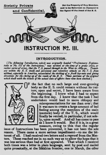 Strictly Private and Confidential. Not the Property of Any Members, and to be Returned on Demand to the Agent of the Head of the N.S. INTRODUCTION. [The following Introduction, which was originally headed "Preliminary Explanations to No. III of the Instructions," was written at the time of a grave crisis, or rather series of crises, that the T.S. passed through in the West in 1889-90. Treachery within the E.S. itself, and persistent and relentless attacks on the T.S. from without, especially in America, necessitated the striking of a fresh key-note and giving directions for the closing up of the ranks of the E.S. Those portions of the original which dealt with the details of the actual state of affairs have now been omitted.] OF the fact that no such large and ever-growing body as the E.S. could remain without its traitors, open and secret, I have been aware from the beginning. I knew what I had to expect from the first day. I knew that the task I had undertaken would lead to more obloquy and misrepresentations for me than ever; that it was sure to create a large amount of bad feeling among the members of the main (exoteric) body of the T.S., which would finally be vented, in particular, if not solely, upon myself. And all has come to pass as I knew it would. But if it is, in a great measure, owing to this that the regular issue of Instructions has been prevented, it has not been the sole reason. There came a more serious impediment -- to me the bitterest of all. I had received two letters and a reproof from the Masters. These reached me in no such way as to allow the hope that it was less serious than had at first appeared. That which I received both times was a letter in plain language, sent by post and mailed quite prosaically, at the Sikkhim frontier, one in March, the other in August, 1889. The last of these left me no ephemeral hope that I had misunderstood or even exaggerated the facts. In their first, our Masters were displeased, and in their last, which arrived just as the news of a flagrant case of treachery reached me, that displeasure became still more apparent. I was told to keep back Instruction No. III until further developments, and then to make those portions of the contents of the Masters' letter that related to the E.S. known to all its members, without even omitting to show them how mistaken and dangerous had been my policy in the E.S. from its beginning. I had been warned by the Council and my trusted friends, of the danger there was in admitting such a number of persons, scattered so widely over the world, who, it was added, knew me not, except on hearsay, and each of whom I had no other means, as they supposed, of studying, than through their auras and photographs. I myself realized that danger, but had no means of averting it, since the Book of the Discipline and Rules states that: "No one shall be refused admission, of the chance of learning truth and thereby improving his life, only because some one, or even all his neighbours think ill of him." Such is the rule. Therefore, the larger the number of applicants who take the pledge, the greater the possibility of helping the masses. A member of the T.S. may be utterly unfit for the higher sciences and never grasp the true teachings of Occultism and Esoteric Philosophy; but yet if he has the true spark of the divine, and faith in the real presence of the HIGHER SELF in him, he will remain loyal to his pledge, and will try to model his life in accordance with the rules of the E.S., and thereby become nobler and better in every case. Membership in the E.S. and "pledges" signed, sent, and accepted, are no warrants for a high success, nor do these pledges aim at making of every student an adept or a magician. They are simply the seeds in which lurks the potentiality of every truth, the germ of that progress which will be the heirloom of only the seventh perfect Race. A handful of such seeds has been entrusted to me by the keepers of these truths, and it is my duty to sow them there, where I perceive a possibility of growth. It is the parable of the Sower put once more into practice, and a fresh lesson to be derived from its new application. The seeds that fall into good ground will bring forth fruit an hundredfold, and thus repay in each case the waste of those seeds which will have fallen by the wayside, on stony hearts and among the thorns of human passions. It is the duty of the Sower to choose the best soil for the future crops. But he is held responsible only so far as that ability is directly connected with the failures, and that such are solely due to it; it is the Karma of the individuals who receive the seeds by asking for them, that will repay or punish those who fail in their duties to their HIGHER SELF. Nature is ever struggling, even in its so-called inorganic and inanimate kingdoms, towards progress and perfectibility by production; how much more so the nature of conscious, thinking man! Each of us, if his nature is not productive or deep enough of itself, may borrow and derive material for soil from the seeds themselves which he receives; and everyone has the means of avoiding the scorching sun, and of forcing the seeds to strike root, or preventing the thorns choking them, with very little effort indeed. Therefore my mistake did not lie in that I accepted too readily applications to join the E.S. Nor have I sinned even in accepting men and women of whom I have not felt quite sure, though the opportunity of discerning their inner natures was possible and given to me in almost every instance. I have not sinned in this, I say, as some think, because the Rules teach again that the grand ethics taught in the secret Aryasanga schools are not for the benefit or perfection of saints, but verily of sinners who need moral and intellectual help. In what particular, then, have I failed to do my duty? Simply in this, as am shown: I have begun to give out Eastern teachings to those who are unacquainted with the Easter