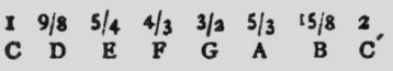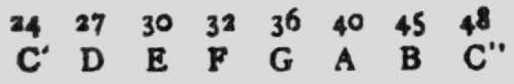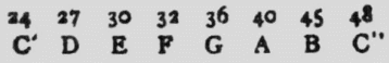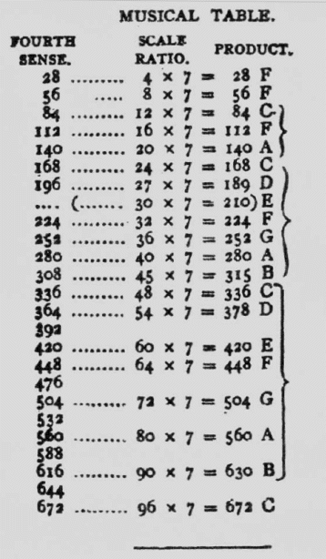 By a similar calculation we can put an octave below C', and above C". Writing these three octaves in line, and multiplying by seven, we obtain a nearly exact correspondence with our table of vibrations for the fourth sense. MUSICAL TABLE