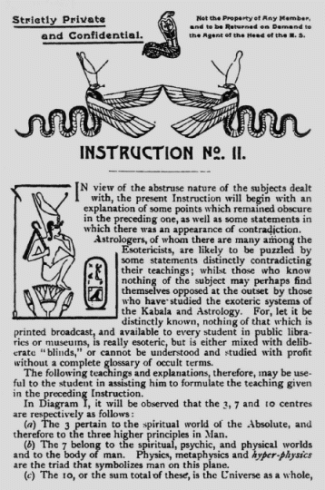 PRINTED PRIVATELY ON THE H.P.B. PRESS Strictly Private and Confidential Not the Property of Any Member, and to be Returned on Demand to the Agent of the Head of the N.S. INSTRUCTION NO. II. IN view of the abstruse nature of the subjects dealt with, the present Instruction will begin with an explanation of some points which remained obscure in the preceding one, as well as some statements in which there was an appearance of contradiction. Astrologers, of whom there are many among the Esotericists, are likely to be puzzled by some statements distinctly contradicting their teachings; whilst those who know nothing of the subject may perhaps find themselves opposed at the outset by those who have studied the exoteric systems of the Kabala and Astrology. For, let it be distinctly known, nothing of that which is printed broadcast, and available to every student in public libraries or museums, is really esoteric, but is either mixed with deliberate "blinds," or cannot be understood and studied with profit without a complete glossary of occult terms. The following teachings and explanations, therefore, may be useful to the student in assisting him to formulate the teaching given in the preceding Instruction. In Diagram I, it will be observed that the 3, 7 and 10 centres are respectively as follows: (a) The 3 pertain to the spiritual world of the Absolute, and therefore to the three higher principles in Man. (b) The 7 belong to the spiritual, psychic, and physical worlds and to the body of man. Physics, metaphysics and hyper-physics are the triad that symbolizes man on this plane. (c) The 10, or the sum total of these, is the Universe as a whole, in all its aspects, and also its Microcosm-Man, with his ten orifices. Laying aside, for the moment, the Higher Decad (Kosmos) and the Lower Decad (Man), the first three numbers of the separate sevens have a direct reference to the Spirit, Soul and Auric Envelope of the Human Being, as well as to the Higher Supersensual World. The lower four, or the four aspects, belong to Man also, as well as to the Universal Kosmos, the whole being synthesized by the Absolute. If these three discrete or distributive degrees of being be conceived, according to the symbology of all the Eastern religions, as contained in one Ovum, or EGG, the name of that EGG will be Swabhavat, or the ALL-BEING on the manifested plane. This Universe has, in truth, neither centre nor periphery; but in the individual and finite mind of man it has such a definition, the natural consequence of the limitations of human thought. In Diagram II, as already stated therein, no notice need be taken of the numbers used in the left-hand column, as these refer only to the Hierarchies of the Colours and Sounds on the metaphorical plane, and are not the characteristic numbers of the human principles or of the planets. The human principles elude enumeration, because each man differs from every other, just as no two blades of grass on the whole earth are absolutely-alike. Numbering is here a question of spiritual progress and the natural predominance of one principle over another. With one man it may be Buddhi that stands as number one; with another, if he be a bestial sensualist, the Lower Manas. With one the physical body, or perhaps Prana, the life principle, will be on the first and highest plane, as would be the case in an extremely healthy man, full of vitality; with another it may come as the sixth or even seventh downward. Again, the colours and metals corresponding to the planets and human principles, as will be observed, are not those known exoterically to modern Astrologers and Western Occultists. Let us see whence the modern Astrologer got his notions about the correspondence of planets, metals and colours. And here we are reminded of the modern Orientalist, who, judging on appearances, credits the ancient Akkadians (and also the Chaldeans, Hindus and Egyptians) with the crude notion that the Universe, and in like manner the earth, was like an inverted, bell-shaped bowl! This he demonstrates by pointing to the symbolical representations of some Akkadian inscriptions and to the Assyrian carvings. It is, however, no place here to explain how mistaken is the Assyriologist, for all such representations are simply symbolical of the Khargak-kurra, the World-Mountain, or Meru, and relate only to the North Pole, the Land of the Gods. [1] Now, the Assyrians arranged their exoteric teaching about the planets and their correspondences as follows: