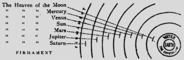 This is the arrangement now adopted by Christian Astrologers, with the exception of the order of the days of the week, of which, by associating the solar planetary names with the lunar weeks, they have made a sore mess, as has been already shown in Instruction I. This is the Ptolemaic geocentric system, which represents the Universe as in the following diagram, showing our Earth in the centre of the Universe and the Sun a planet, the fourth in number: The Heaven of the Moon And if the Christian chronology and order of the days of the week are being daily denounced as being based on an entirely wrong astronomical foundation, it is high time to begin a reform also in Astrology built on such lines, and coming to us entirely from the Chaldean and Assyrian exoteric mob. But the correspondences given in our Instructions are purely esoteric. For this reason it follows that when the planets of the solar system are named or symbolized (as in Diagram II) it must not be supposed that the planetary bodies themselves are referred to, except as types on a purely physical plane of the septenary nature of the psychic and spiritual worlds. A material planet can correspond only to a material something, Thus when Mercury is said to correspond to the right eye it does not mean that the objective planet has any influence on the right optic organ, but that both stand rather as corresponding mystically through Buddhi. Man derives his Spiritual Soul (Buddhi) from the essence of the Manasa Putri, the Sons of Wisdom, who are the Divine Beings (or Angels) ruling and presiding over the planet Mercury. In the same way Venus, Manas and the left eye are set down as correspondences. Exoterically, there is, in reality, no such association of physical eyes and physical planets; but esoterically there is; for the right eye is the "Eye of Wisdom," i.e., it corresponds magnetically with that occult centre in the brain which we call the "Third Eye"; [2] while the left corresponds with the intellectual brain, or those cells which are the organ on the physical plane of the thinking faculty, The Kabalistic triangle of Kether, Chocmah and Binah shows this. Chocmah and Binah, or Wisdom and Intelligence, the Father and the Mother, or, again, the Father and Son, are on the same plane and react mutually on one another. When the individual consciousness is turned inward, a conjunction of Manas and Buddhi takes place. In the spiritually regenerated man this conjunction is permanent, the Higher Manas clinging to Buddhi beyond the threshold of Devachan, and the Soul, or rather the Spirit, which should not be confounded with Atma, the Super-Spirit, is then said to have the "Single Eye." Esoterically, in other words, the "Third Eye" is active. Now, Mercury is called Hermes, and Venus, Aphrodite, and thus their conjunction in man on the psycho-physical plane gives him the name of the Hermaphrodite, or Androgyne. The absolutely Spiritual Man is, however, entirely disconnected from sex. The Spiritual Man corresponds directly with the higher "coloured circles," the Divine Prism which emanates from the One Infinite White Circle; while physical man emanates from the Sephiroth, which are the Voices or Sounds of Eastern philosophy. And these "Voices" are lower than the "Colours," for they are the seven lower Sephiroth, or the objective Sounds, seen, not heard, as the Zohar (11, 81, 6) shows, and even the Old Testament also. For, when properly translated, verse 18 of chapter XX Exodus would read: "And the people saw the Voices," (or Sounds, not the "thunderings," as now translated); and these Voices, or Sounds, are the Sephiroth. [3] In the same way the right and left nostrils, into which is breathed the "Breath of Lives" (Genesis, II, 7), are here said to correspond with the Sun and Moon, as Brahma-Prajapati and Vach, or Osiris and Isis, are the parents of the natural life. This Quaternary, viz: the two eyes and two nostrils, Mercury and Venus, Sun and Moon, constitutes the Kabalistic Guardian-Angels of the Four Corners of the Earth. It is the same in the Eastern esoteric philosophy, which, however, adds that the Sun is not a planet, but the central star of our system, and the Moon a dead planet, from which all the principles are gone, both being substitutes, the one for an invisible inter- Mercurial planet, and the other for a planet which seems to have now altogether disappeared from view. These are the Four Maharajahs of the Secret Doctrine, [4] the "Four Holy Ones" connected with Karma and Humanity, Kosmos and Man, in all their aspects. They are: the Sun, or its substitute Michael; Moon, or substitute Gabriel; Mercury, Raphael; and Venus, Uriel. It need hardly be said here again that the planetary bodies themselves, being only physical symbols, are not often referred to in the Esoteric System, but, as a rule, their cosmic, psychic, physical and spiritual forces are symbolized under these names. In short, it is the seven physical planets which are the lower Sephiroth of the Kabala and our triple physical Sun whose reflection only we see, which is symbolized, or rather personified, by the Upper Triad, or Sephirothal Crown. All this will be demonstrated. [5] Then, again, it will be well to point out that the numbers attached to the psychic principles in Diagram 1 appear the reverse of those in Plate I. This, again, is because numbers in this connection are purely arbitrary, changing with every school. Some schools count three, some four, some six, and others seven, as do all the Buddhist Esotericists. In Plate I, the numbers of the principles disagree with the numbers used in Diagram I, simply because the first are those hitherto used in the semi-exoteric teachings of Theosophy, for instance in Esoteric Buddhism. As said in the Secret Doctrine, [6] since the fourteenth century the Esoteric School has been divided into two departments, one for the inner Lanoos, or higher Chelas, the other for the outer circle, or lay Chelas. Mr. Sinnett was disti