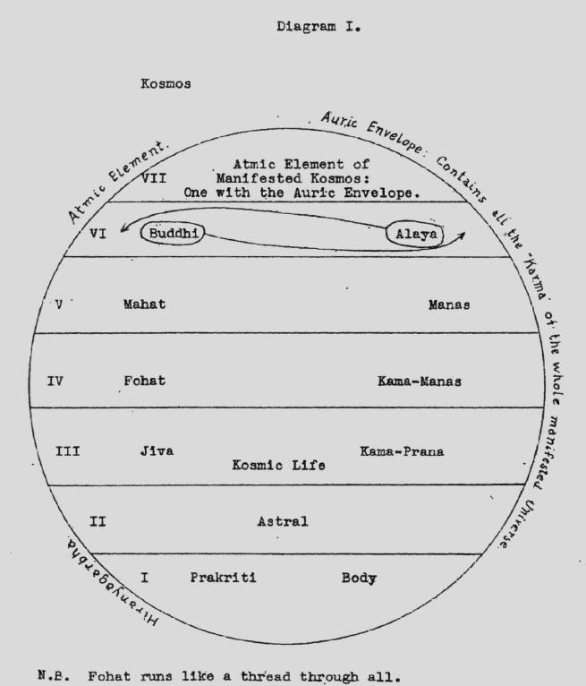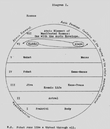 The Septenary of Consciousness of the Terrestrial objective Plane. Notes: Perceptive life begins with the Astral; it is not our physical atoms which see, etc. Consciousness proper begins between Kama & Manas. Atma-Buddhi act more in the atoms of the body, in the baccilli, microbes, etc. than in man himself. 1. Sensuous, objective consciousness: all that pertains to the five physical senses in man, animals, birds, fishes & some insects etc. Here are the "Lives"; their consciousness in Atma-Buddhic; these are without manas entirely. 2. Astral Consciousness: viz. that of plants (sensitive), of ants, spiders, & also some night flies (Indian), but not of bees. The vertebrate animals are without this consciousness, but the placental animals have all the potentiality of man-consciousness, though of course it is at present dormant. Idiots act on this plane; the common phrase, "he has lost his mind," is an occult truth. For when through fright, etc. the lower mind becomes paralyzed, then the consciousness acts on the astral plane. The study of lunacy will throw much light on this point. This may well be called the "nerve-plane"; it is cognised by our "nervous senses," of which physiology knows nothing: #Ex: Clairvoyant reading with the eyes bound, from the pit of the stomach etc. This is greatly developed in the deaf & dumb. 3. Kama-Pranic Consciousness: the general life consciousness which belongs to all the objective world, even to the stones; for if the stone were not sentient it could not emit a spark. Affinity between chemical elements is a manifestation of this Kamic consciousness. Again, there, where there is decay, must also be life, etc. Stones crumble away. 4. Kama-Manasic Consciousness: the instinctual consciousness of animals & idiots in its lowest degrees; the planes of sensation; in man these are rationalized, e.g., a dog shut up in a room has the instinct to get out, but cannot because its instinct is not sufficiently rationalized; whereas a man at once takes in the situation & extricates himself. The highest degree of this Kama-Manasic consciousness is the psychic (Ex: when under laughing-gas). Thus there are seven degrees, from the instinctual animal to the rationalized instinctual, or psychic. 5. Manasic Consciousness: hence Manas stretches up to Mahat. 6. Buddhic Consciousness: the plane of Buddhi & the Auric Envelope; from here it goes to the "Father in Heaven" (Atma) & reflects all that is in the Auric Envelope. Five & Six, therefore, cover the planes from the psychic to the Divine. Notes. Reason is a thing which wavers between right & wrong; but Intelligence (Intuition) is higher, it is the clear vision. To get rid of Kama Rupa, we must crush all our material instincts ("crush out matter"). "The flesh" is a thing of habit, it will repeat mechanically a good impulse as well as a bad. It is not the flesh which is always the tempter, in nine cases out of ten it is the Lower Manas which, by its images, brings the flesh into temptation. Samadhi: The highest Adept begins his Samadhi on the fourth Solar plane, but cannot go out of the Solar system; when he begins Samadhi he is on a par with some of the Dhyan Chohans, but transcends them as he rises to the seventh plane (Nirvana). Silent Watcher: The Silent Watcher is on the fourth Kosmic Plane. Will, Desire: The Higher Mind directs the Will, the Lower turns it into selfish desire. The Dhyan Chohans are passionless, pure, & mindless; they have no struggle, no passions to crush. Pitris: The Pitris are the "Astral" overshadowed by Atma-Buddhi, which was attracted to matter. The "puddings" had Life & Atma-Buddhi, but no Manas. They were therefore senseless. The Great "Why." The reason of all evolution is the gaining of experience. The Dhyan Chohans are made to pass through the "schools of life": -- "God goes to school." Astral: The Astral Body is first in the womb; then comes the germ & fructifies it; it is then clothed in matter just like the Pitris. Chhaya: The Chhaya is really the Lower Manas, the Shadow (of the Higher Mind); This Chhaya makes the Mayavi Rupa. The Ray clothes itself in the highest (7th) degree of the Astral Plane. In the fifth Round all of us will play the part of Pitris; we shall have to go & shoot out our Chhayas into another humanity, & remain until that humanity is perfected. The Pitris have finished their office in this Round & have gone into Nirvana, but will return to do the same office up to the middle point of the next Round. The fourth, or Kamic, Hierarchy of Pitris becomes the man of flesh. A.E. The A.E. takes up the light of Atma & overshadows the coronal, & circles round the head. Additional Notes (from A.B.'s book). "The best of us in the future will be Manasa-Putras, the lowest will be Pitris. We are seven intellectual Hierarchies here. This earth becomes the Moon of the next earth." (H.P.B.) A question was asked: -- "Does the Mayavi Rupa have its laya centre in the heart?" H.P.B. "The Mayavi Rupa is composed of the Astral body as Upadhi, the guiding intelligence from the heart, the attributes & qualities from the Auric Envelope. VII. December 17, 1890 Present: I.C-O., E.K., W.H.O., C.F.W., E.T.S., A.L.C., G.B.S.M., H.A.W.C., L.M.C., C.W., A.B. Auric Fluid: The Auric Fluid is a combination of the Life & Will principles, the Lfe & Will being one & the same in Kosmos. It emanates from the eyes & hands, when directed by the will of the operator. Auric Light: The Auric Light surrounds all bodies; it is the "aura" emanating from them, whether they be animal, vegetable, or mineral. It is the light e.g. seen round magnets. The three Logoi: Atma-Buddhi-Manas in man correspond to the three Logoi in Kosmos. They not only correspond, but each is the radiation from Kosmos to Micro-Kosmos. The third Logos, Mahat, becomes Manas in man, Manas being only Mahat individualised, as the sun-rays are individualised in bodies that absorb them. The sun-rays give life, they fertilize what is already there, & the individual i