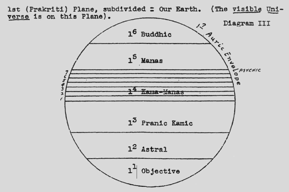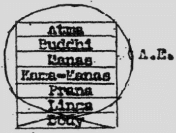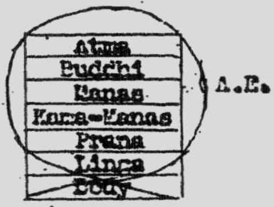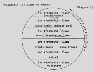 One with the Auric Envelope. Atmic Element. Auric Envelope: Contains all the "Karma" of the whole manifested Universe. Hiranyagarbha. N.B. Fohat runs like a thread through all. Diagram 2: "Prakriti" (I) Planes of Kosmos 7th: the A.E. of the Solar System Diagram 3: 1st (Prakriti) Plane, subdivided = our Earth. (The visible Universe is on this Plane). 16 Buddhic VI. December 3, 1890 Present: C.W., H.A.W.C., A.L.C., E.K., G.R.S.M., I.C-O., L.N.C., W.R.O., A.B., C.F.W. H.P.B. continued to explain the planes of consciousness. General Notes on Kosmic Septenary. Fohat: Fohat is everywhere; it runs like a threat through all & has its own 7 divisions. Auric Envelope: In the Kosmic Auric Envelope is all the Karma of the manifesting Universe; this is the Hiranyagarbha. Jiva is everywhere; so with the other principles. The diagram (2) represents the type of all Solar Systems. General Notes. Taking the figure to represent the human principles & planes of consciousness, then: -- 7, 6, 5, = Siva, Vishnu, Brahma; Brahman being the lowest. Siva, Vishnu, Brahma: Shiva is the four-faced Brahma, the Creator, Preserver, Destroyer & Regenerator. Between 5 & 4 comes the Antaskarana. The