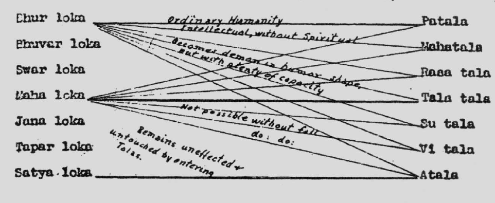 2. Vitala: Here are the Hierarchies of the Celestial Buddhas, or Bodhisattvas, who are said to emanate from the seven Dhyani Buddhas. S.W. It is related on earth to Samadhi, to the Buddhic consciousness in man. No adept, save one, can be higher than this & live; if he passes into the Atmic, or Dharmakaya state (Alaya), he can return to earth no more. These two states are purely hyper-metaphysical. 3. Sutala: A differentiated state, corresponding on earth with the H. Manas, & therefore with Sabda (Sound), the Logos, our H. Ego; and also to the Manushi Buddha state, like that of Gautama on earth. This is the third state of Samadhi (which is septenary). Here belong the Hierarchies of the Kumaras, Agnishwattas, &c. 4. Karatala: Corresponds with Sparsa ("touch"), & to the Hierarchies of ethereal, semi-objective Dhyan Chohans of the astral nature of the Manasa-Manas, or the pure ray of Manas that is the L. Manas before it is mixed with Kama (as in the young child). They are called Sparsa Devas, the Devas endowed with "touch." (These Hierarchies of Devas are progressive: the first has one sense, the second two, & so on to seven. Each containing all the senses potentially, but not yet developed. Sparsa would be better rendered by "affinity," "contact.") 5. Rasatala: or Rupatala, corresponds to the Hierarchies of Rupa, or "sight" -- Devas, possessed of three senses (sight, hearing & touch). These are Kama-Manasic entities, & the highest Elementals. With the Rosicrucians they were the Sylphs & Undines. It corresponds on earth to an artificial state of consciousness, such as that produced by hypnotism & drugs (morphine, &). 6. Maha-tala: Corresponds to the Hierarchies of Rasa, or "taste" Devas, & includes a state of consciousness embracing the lower five senses, & emanations of life & being. It corresponds to Kama & Prana in man, & to Salamanders & Gnomes in nature. 7. Patala: Corresponds to the Hierarchies of Ghanda, or "smell" -- Devas; the underworld or antipodes -- Myalba. The sphere of irrational animals, having no feeling save that of self-preservation & gratification of senses; & also of intensely selfish human beings, waking or sleeping. This is why Narada is said to have visited Patala, when he was cursed to be reborn; he reported that life there was very pleasant for those "who had never left their birthplace," they were very happy. It is the earthly state, & corresponds to the sense of smell. Here are also animal dugpas, elementals of animals, & nature-spirits. Further explanation of the same Classification: -- 1. Auric, atmic, alayic sense, or state; one of full potentiality, but not of activity. 2. Buddhic, the sense of being one with the Universe; the impossibility of imagining itself apart from it. (It was asked why the term Alayic was here given to the Atmic, & not to the Buddhic state? Ans: -- These classifications are not hard & fast divisions. A term may change places according as the classification is exoteric, esoteric, or practical. For the Inner Group the effort should be to bring all things down to states of consciousness. Buddhi is one & indivisible really; it is a feeling within, absolutely inexpressible in words. All cataloging is useless to explain it.) 3. Sabdic, sense of hearing. 4. Sparsic, sense of touch. 5. Rupic, the state of feeling oneself a body, & perceiving it (Rupa -- form). 6. Rasic, sense of taste. 7. Ghandic, sense of smell. All the Kosmic & anthropic (man) states & senses correspond with our organs of sensation, Gayanendriyas, rudiments or organs for receiving knowledge through direct contact, sight, &c. These are the faculties of Sarira, through Netra -- eyes, nose, speech, &c. & also with the organs of action, Karmendriyas, hands, feet, &c. Exoterically these are five sets of five, giving 25. Of these twenty are facultative & five Buddhic. Exoterically Buddhi is said to perceive; esoterically it obtains perception only through the H. Manas. Each of these twenty is either positive or negative, thus making forth in all. There are two subjective states answering to the four sets of five, hence 8 in all. These being subjective cannot be doubled. Thus we have 40 + 8 = 48 "cognitions of Buddhi." These with Maya, which includes them all, = 49. (Once you have reached the cognition of Maya, you are an Adept. Jan. 8, 1891. (Rao B.K. Laheri took the Pledge in the presence of I.C-O., L.M.C., W.R.O., C.F.W., & G.R.S.M.) Notes: Jan. 11, 1891. In their exoteric blinds the Brahmins count 14 Lokas (the Earth included), of which 7 are objective, though not apparent; & 7 subjective, yet fully demonstrable to the Inner man. These are the: -- 7 Divine Lokas (1) Bhur-loka (the Earth) (2) Bhuva-loka (the space between the earth & the Sun -- Munis.) (3) Swar-loka (the space between the Sun & the Pole Star -- Yogis) (4) Mahar loka (the space between the earth & the uttermost limit of the solar system.) [1] (5) Jana loka (beyond the solar system, the abode of the Kumaras, who do not belong to this plane.) (6) Tupar loka (state beyond the Mahatmic region, the dwelling Vairaja deities). (7) Satya loka (the abode of the Nirvanees.) 7 Informal (terrestrial) Lokas (1) Patala (our earth). (2) Maha tala. (3) Rasa-tala. (4) Tala-tala (also Kara-tala). (5) Sutala. (6) Vitala. (7) Atala. [2] Now all these 14 are planes from without within, & states of consciousness through which man can pass, & must pass, once he is determined to go through the 7 Paths & Portals of Dhyani. One need not be disembodied for this. All it is is reached on earch in one, or many, of the incarnations. Notice the order: -- the four lower ones (1, 2, 3, 4) are rupa, i.e. they are performed by the inner man with the full concurrence of the diviner portion, or element, of the L.Manas, & consciously by the personal man. The three higher states cannot be reached & remembered by the latter, unless he is a fully initiated Adept. A Hatha-Yogi will never pass beyond the Mahar loka, psychically; & the Tala-loka, (double, or