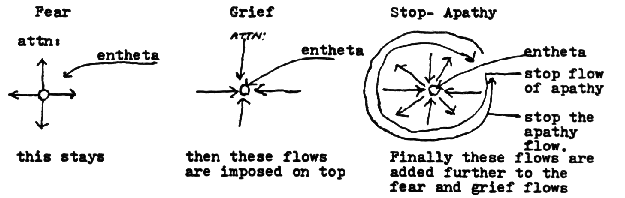 They all run out. 74. The high society crowd has the threefold and three-flow wave construction trap of escape, boredom, and insincerity. 75. There is a flinch before impact. Attention units in a band surround the thetan and the body, thus the incident and above flows occur before physical impact, not after or during, and the incident stops before the impact which sticks it. 76. Thus electrically it is over before it physically happens, and the closing decision is there at the close of the electrical incident. The physical impact of the receipt of the entheta cements the decision in. The fear-grief-apathy-stop electrical cycle, can and usually does precede actual impact, although the previous drawing showed the grief flows occurring at point of impact. So there is an electrical, emotional incident which can, and usually does, occur prior to the physical occurrence. It can occur during the physical occurrence, It can occur after the occurrence (person coming out of shock). The later two are more rare. 77. Run attention units flowing in/out of ridges, hollow spots, and areas of motionlessness. 78. Apathy walls under -traditional auditing could take 100's or 1000's of hours to discharge by itsa. Running the flows per "73" aforementioned takes a few minutes. 79. Every emotion that is locked onto a thetan, is locked onto them solely by its aesthetic harmonic . 80. Erase the concept of aloneness. 81. Erase packing up on a ridge (groupers), and all holders, denyers, and forgetters (which are flows). 82. Erase fighting back against overts, motivators, deserved actions, and obsessions. 2wc what if now was somebody else's then. 83. Run out making, others fight obsessions. 84. Run out you running away from, and making others run away from, 85. Run out the 9 obvious processes of 1. motion inwards, 2. you going away from, 3. holding onto