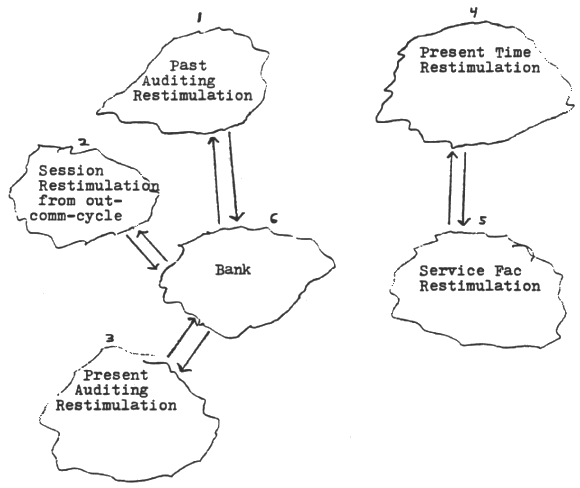 Please note there is no connection between the left 4 and the right 2 sets of clouds. If you take the Ser Fac out, the PT restimulation, all the other little clouds are going to decrease incredibly. The Ser Fac on the pc is being mocked up right now by the pc. He keeps that particular GPM in restimulation. Ser Facs precede GPMs, in other words, there are two sources of lightning on a case. The auditor restimulates something by putting or letting the pc put attention on an inert incident that will restimulate charge. If something comes up on the order of the best way to handle a situation is to get sick, practically everyone alive has a Ser Fac like this, and it will go back track very easily and very fast. If you want a pc's attention on a cow, let him say it, don't you say it. In controlling a pc's attention, get him to say it. The whole of restimulation can be resolved by getting someone to name it, for instance, on an ARC break, have them name who, what, when, where, why the upset occurred. If you name it, you can prevent Itsas; if you get them to name it, it will encourage Itsa. So, session roughness can be caused by an auditor naming things or preventing Itsas. If you are not going to pick up an Itsa line on something, then don't name it. In smooth auditing, you don't name things and you let the Itsa out. The source of restimulation can often come from social machinery like asking someone how they have been before the session. The auditor is in control of what is restimulated to a marked degree, probably to a degree beyond your imagination. It is to the auditor's and pc's benefit to get rid of the Ser Fac. About 2 1/2 hours of auditing a week is about enough to hold down environmental restimulation. Most trouble regarding day to day restimulation is from the pc's Ser Fac. As demeaning as it may be to ones self-esteem, you should recognise that your pc apparently, consciously does not know what he is doing. Your pc will try to make you wrong as you approach his Ser Fac. You should judge your pcs by their restimulation. Be aware of the solution that reduces that restimulation. Any pc that is running badly is over restimulated and the resolution of this is to run the Ser Fac off. If you will destimulate another's life, they will recover. A restimulative environment for the pc can be named and what ever that name is will lead you right into a Ser Fac. In reducing over restimulation, you can reduce session restimulation by doing clean auditing. You can reduce past auditing restimulation by auditing it. You can reduce current auditing restimulation by auditing it, you can reduce environmental restimulation by auditing it. After you have those four clouds out of the way, you run the Ser Fac. You can resolve a case by reducing restimulation. After reducing restimulation, you will then run out the bank. A case is as hard to run as it: