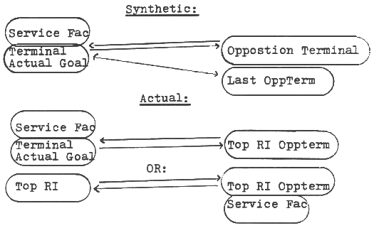 If you know these things thoroughly, you should approach and proceed to erase your preclear's Service Facsimile. A hidden standard is a standard a person has by which he judges things. It is what he measures his progress by. All insanity is an exaggeration of normal to the exclusion of not dramatising others dramatisations. Aberration is the exaggeration of the positive or negative of the usual, in other words, anything a person does is in the extreme. Once a person has exteriorized, in other words, left the body, people are generally turned against aberration, but before exteriorization, people are against the whole subject of exteriorization The idea of leaving the body happens to be a departure from the norm and so people think it is aberrated to leave the body. You can take a hidden standard into a process and audit it. You can get a hidden standard by asking what a person mainly complains about in auditing or what is their chronic psychosomatic illness, you can then date it and get an Itsa line going, and get them to talk about it. It will usually physiologically express itself on the person, and you simply date a persons pains, date it down to the second. If it is part of an engram, you can then use R3R and erase the engram out. You should watch for overrun. The tone arm (TA) that runs off a case is normally the result of confusion as-ising, not the stable datum running off. Stable data as-ises in a few seconds or less. In R3Ring or erasing pictures out, if you start stumbling against GPMs or Ser Facs, it's like shooting a rifle at a battleship. You can get magical, sporadic wins with R3R, but over using it can be a liability. In R3N, where you handle implants, the difference from each pc's actual track can vary quite a bit. You will run across goals like -to be alone. Ironically, implants have no aberrative value to speak of except the fact that they get all their charge from a person's actual GPMs, which happens to be a huge amount of charge. So, people end up acting out their implants. R3N is a process developed to run out actual GPMs. The bulk of the wordings used in actual GPMs are then reimplanted into a person with a synthetic line plot. It is confusing to the being because it is a mockery of a person's own creation. The Ser Fac will normally fit on the top terminal. You can draw a Ser Fac and a line over and there is a terminal. The opp-terminal, on the other side which you can draw, is very similar to your last terminal at the bottom. You can draw arrows to those two and say these are very similar. In finding a Ser Fac that will lead you right to the pc's RI top GPM which could as simple as a goal "to be". These are a long time ago. If you would write trillion on the blackboard a hundred you would have a view of the medieval period of history thirteen trillions would be modern life. Lets illustrate: The pcs Top RI, on Top GPM, on which a synthetic plot was installed: