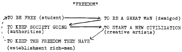 So, that is how he erases an incident. Of course, one goes earlier similar, if it goes more solid and there is no earlier beginning and the one he is running is not erasing. So, that is the Solo Course. It takes anywhere from 10 - 30 hours for a person to do the Solo Course. It averages around 20 hours. The reason that it sometimes takes 30 hours is that some people have been in the church as auditors, and you have to untrain their bad habits, straighten out their misunderstoods One auditor that had audited 5,000 hours in the church, just years and years, and had been auditing for 20 years, did not understand TR-4 and a number of other things I won't mention here. But it can be pretty tragic. If someone has never done any auditing, they will find it quite new, quite exciting, and you don't have any contaminated ideas to clear out of the way. Your next action on them, since they can solo audit is to do some word clearing. You word clear what a Goals-Problems-Mass is which is already defined in here. You clear GPM, as a Goals-Problems-Mass. A GPM is composed of mental masses and significance's which have an exact pattern unvarying person to person whose significance's dictate a certain type of behaviour and whose masses when pulled in on the individual cause psychosomatic illnesses, pains or feelings of heaviness and tiredness. Then, you word clear "end word" as the last word in a goal, the common denominator to the whole of the GPM, the final word of a goal. Then, you word clear -dramatisation as to repeat in action what has happened to one in experiences it is something that is being played out of another time and period and complete dramatisation is complete identity, and that when dramatising, the individual is like an actor playing his dictated part and going through a whole series of irrational actions. You clear up dramatising as a person acting out a script. Then, you explain to the person that approximately 15% of the Reactive Mind is made up of pictures, 85% of it, the core, is made up of goals, huge masses and GPMs and that the 15%, those pictures, have been run off on their Dianetics, and a lot of material has been run off on the other auditing that they have received; however, what you are going to do is ungroup the GPMs that are bunched together on the individual in a manner like the Indians taking passes around the circled covered wagons. What you are going to do here is to just shave off the edges of the Reactive Mind and get another 5% of it erased simply by running off the end words. You clear up that a "lock end word" is a lock onto the end word. Basically explain to the pc at this point that "lousy" is probably not an end word, but if that comes up as an answer and the same type of idea comes to mind, reword it. If they come up with words ending with -ness, -ity, -ion, they are getting warm. Lousy would be a lock on possibly futility or desperation, these would be actual end words and the meter will respond incredibly well when they get the one and the dramatisation will erase. You then issue them the commands for Grade VI, which are run repetitively to EP on each flow.