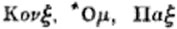 = Conx, Om, Pax, used at the conclusion of the Mysteries of Eleusis, with the Sanscrit Cansha, Om, Pacsha, the first word signifying "object of desire," the second being the familiar sacred syllable of the East, and the third, Pacsha, identical with the Latin vix = change, course, or turn of duty.