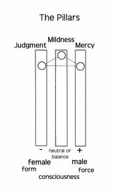 As we mentioned before, the sephiroth are emanations from the divine. They are strongly defined by number and place on the Tree of Life. But what are they? According to Israel Regardie they are considered "to be substantial principles of power-vessels, or categorical ideas in which the consciousness of the universe expresses itself". Sounds mind blowing, doesn't it? They are like vessels or channels, in which and through which the divine powers can manifest themselves in their creative evolution. They are spheres of light, receptacles that hold particular energies as they stream down from the divine source. They are like different potencies emanating from the divine. They are constantly there, always active, never ceasing. They are a medium between the divine, the Absolute (Ain-Soph) and the physical world as we know it. They are characterized by limitation, measure, and concretization. They are gradations of powers, that is why they have different places on the Tree of Life. They are the substance of reality. They emanated from the divine, but are uncreated. The created universe that followed is just a reflection. The question arises, how did they come into being? Therefore we have to have a look at the Beginning. First there is Ain. Ain is Negativity, Nothingness, The Negative Existence, the Great Emptiness, The Absolute, The Absence of Things, The Prime Cause, The Originless Origin of all manifestation. You guessed it; it is not knowable, it is indescribable, everything we say about it, it is not. Then there is Ain Soph. Ain means 'not' and soph means "end". Ain Soph is the Infinite, The Limitless, Infinite Space, Eternity. It is also called the Holy Old One, or the Old One of All Old Ones. Ain Soph is the primal darkness of the absolute unity above anything else. Ain Soph is the one in which everything has its origin, its existence, and to which everything returns. Next we have the Ain Soph Aur. Aur means light. The Ain Soph Aur is the Limitless or Infinite Light. Now the Ain Soph Aur retracts itself within itself to a light point. Here we have substantiality out of nothing. This brings forth Kether (=the Crown), the first Sephira at the top of Tree of Life. Here is the primal vibration of the universe to follow. This light point starts to emit light energy, light rays. This is the primal ocean of subtle ether used for the building of the universe. This subtle ether is polarized into harmonious moving opposites of positive and negative, attraction and repulsion, contraction and expansion. There is harmonious equilibrium. The negative energy creates the Severity (Judgment) pillar on the left side and the positive energy creates the Mercy pillar on the right side of the Tree of Life. And thus the next two Sephiroth arise: Chokmah (Wisdom) on the right side, and Binah (Understanding) on the left side. The left pillar is also called the Pillar of Form, the right pillar the Pillar of Force, and the middle pillar, the Pillar of Consciousness. Of the middle pillar it is said that it both shows how God reveals Himself to us (downward movement) and how it is our path for "conforming to His image" (upward movement). Ok, now we have three Sephiroth, and they form a trinity, called the Supernal triad. Under this trinity is the Abyss. Above the Abyss is the realm of ideas, or the Ideal. Under the Abyss, is the world of the real, or Reality and Causality, in which the next seven Sephiroth are to come. The next seven Sephiroth are the crystallization, the densification, of the subtle ether. Together they produce the universe, the world we know. To the right are all ten Sephiroth of the Tree of life with the columns superimposed. I am using here the traditional names of the Sephiroth. Their names don't always reflect the meaning or content of them. It is not clear why the ancient kabbalists choose those titles. To know what the Sephiroth are about, one needs to read the explanation of each Sephirah. Kether is the first manifested Sephirah, the first condensation of the light of Ain-Soph. Kether means 'the Crown'. It sits like a crown on the top of the Tree of Life, but at the same time is the Crown on top of our head. It is said that Kether encircles and covers the brain of the primordial Man, Adam Kadmon. One might compare it with the Crown Chakra of the yoga system. It is called the Crown because Kether belongs half to the human system (and the Tree of Life) and half to the Divine (or Ain-Soph), like a crown sits on top of the head, but is not quite part of the head itself. Kether connects the Divine and the human. Or, man lives in the universe but does not belong to the universe, but to the divine. Kether is man's connection to the divine. That is why Kether is partly hidden, because of its connection to the Nothingness, and partly manifest because of its connection to the manifested universe. Kether is the source of light rising up from the darkness. It is a monad of pure energy in which all opposites are unified. In Kether is the blueprint of the entire universe. Kether is also called Mashabah, which is consciousness, as Kether is pure consciousness. In Kether resides the divine essence of a person, indestructible. Kether is also called the Crown because of its ability to receive and integrate the divine energy. For me, Kether means the very essence of my being, that divine monad that always has been and always will be. It is immortal, as it is part of the Divine, separated only in my present awareness. Being in Kether I truly can say, "I am the Divine". Kether also represents my birth in this world and all the qualities I have been born with. Chochmah is the second Sephiroth. Chochmah means 'wisdom'. It is the Word, the Logos. It is the Son in relation to Kether as its Father. Remember Chochmah is on top of the right, positive, male pillar, and thus Chochmah is considered to embody the primal male energies. It is the active, male principle, the vital, energizing element of existence. In Chochm