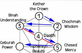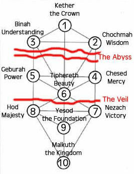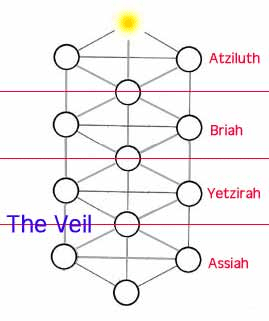 Pillar When we go down the Tree (on the middle pillar of consciousness), on the path of emanation and creation, we first have Kether, where the divine monad is (what we all are in essence) in unity with the Divine. Then we have Daath where the monad gets knowledge of itself as a separate unity. It is aware of the unity of opposites in the world of Atziluth, including the consciousness of being the opposites of 'me and the Divine'. But this divine essence, which has a sense of "I", looks downwards and wants to create. Not only is the next world, Briah created, but it creates itself the sense of an ego, of being an individual, reflected in Tiphereth. Now it sees itself as the center of the universe, and of the Tree of Life. Again it wants to express itself even more, and creates the world of Yetzirah, and an animal self in order to experience form and procreation. This happens in Yesod. Finally it builds itself a physical body in the physical world, the ultimate downwards transformation of itself in its most crystallized form. In Malkuth is the transformation of becoming. It is the transformation of coming down here in the physical world by birth, growing up, learning, developing consciousness. In Malkuth one becomes more than just a body. Then it is time to go up the Tree, the mystical path of transformation. The first transformation happens in Yesod. It is a basic requirement in all initiatory rites, the first thing to happen is the transformation of the animal self, not by suppression, but becoming aware of the 'lower' emotions of passions, desires and sexuality. Then one should learn not to be dominated by these emotions, but to dominate them, to rise above them, to use them when necessary, and to transform the rest of their energies into higher energies. Otherwise one will be bound by animal energies and get nowhere. It is not for nothing that we call people who act primarily from their lower energies 'animals'. But we should not forget that we all have those animal energies in ourselves. And that it is what makes us survive in the physical world. Having 'killed' the 'beast' or 'dragon' in ourselves we can truly be called human. Here we are in Tiphereth, and act with higher emotional energies. The emotions and feelings are more refined. In Tiphereth is the sense of ego, and this is the next transformation that needs to happen. The ego is a construct and tries to maintain its existence by reinforcing "I-Me-Mine". The ego is a necessary value to express ourselves but it keeps us separated from others. It is when we open up to other people, to other living beings on the planet, to nature, to the energies around us, to the entire universe, that a profound transformation happens. The sense of ego diminishes and one finds oneself as a part of a complex world of beings, like and unlike oneself. Here a person starts to feel that he is one with the universe. Sacrifice of the ego is traditionally symbolized by the crucifixion, which is one of the symbols of Tiphereth. The next transformation happens in Daath when one enters the world of Atziluth. In Daath one not only gains knowledge of his divine self, but one becomes his divine essence. Actually he always has been, but now he has become aware of it again. In Daath he transcends the strong sense of duality that still pervaded his being in the world of Briah, and now he knows the duality is only a perception. Now he sees duality in unity. In Daath he enters into unity. Although there is still a sense of duality between "I" and the Divine, he is in unity with the divine energies and everything that exists. This is a profound transformation called in yoga terms the transformation into the diamond body, it is the realization of the "true essence" of man. The last transformation happens in Kether where one enters the Divine, not to return anymore. Also note that coming down the Tree of Life, be it via the middle pillar, or via the way of the Shekinah (through the successive Sephiroth), it is a process of continuing contraction. Ascending the Tree is a process of continuing expansion. The Boundaries of the Four Worlds A word here on the Veil and the Abyss. Information is not available about them. There is not really a veil or an abyss, they are symbols for a transformation, a leap in consciousness, or a leap into another world. There should also be a third boundary that I have called the Wall. I will explain here why there is a third one, why they are all situated on the boundaries between the four Worlds. The Veil Different kabbalists place the Veil on different places, sometimes underneath Tiphereth, sometimes just above or below Yesod. They don't seem to know just where to put it. What actually is the meaning of those two terms? They are boundaries. A veil or curtain is often used in initiations. Once one has passed the veil or curtain one has stepped into another, hidden world. Like the Veil behind the High priestess in the Tarot. The Abyss has the same meaning. Crossing the Abyss means that one has stepped into another realm. A veil or curtain is made out of cloth, and cloth is the most natural, man-made thing used to cover things up. The genitals (Yesod) is the first area of the body that is covered up with a piece of cloth. It is my opinion that the Veil on the Tree of Life is situated at the boundary of the world of Assiah and the world of Yetzirah. That is in complete accordance with the traditional meaning of initiating a novice. One leaves the mundane world aside and steps for the first time into the inner realms of the human psyche which lie just beyond the physical. It is called the Veil because a veil covers up something. Lifting a veil or a curtain is like stepping in another room. The Abyss The Abyss traditionally is situated underneath Chochmah and Binah, and it is said that Daath lies across it. This corresponds with the boundary of the world of Briah and the world of Atziluth. This boundary is called the Abyss because the transfor