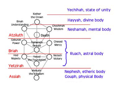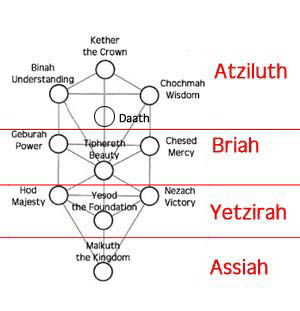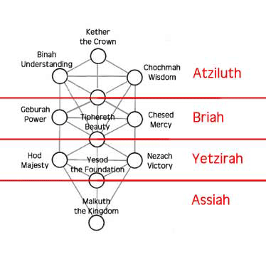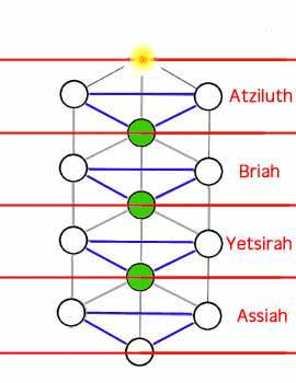 The Tree of Life and the Four Worlds The Four Worlds relate to the Tree of Life in different ways. They are all equally valid and the different system are just different ways to look at the same thing, like a diamond that shows different colors under different angles of view. One way to look at it is by saying that the Tree of Life exists in each World, thus we have four Trees, an Atziluth tree, a Briah tree... Thus we have, for example, a Tipheret Sephirah in each of the four worlds, each having different qualities according to the World it is in. Another way is that the ends of the Tree of life overlap when crossing a World. Malkuth of Atziluth becomes Kether of Briah; Malkuth of Briah becomes Kether of Yetzirah; and Malkuth of Yetzirah becomes Kether of Assiah.