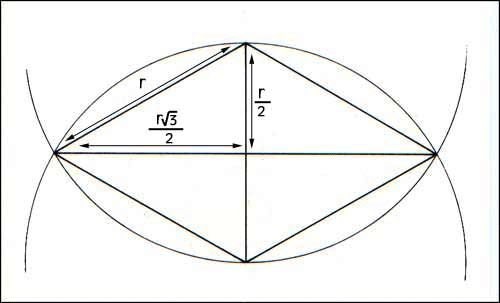 When we call the radius of the circle r, then the following mathematical expressions appear: Besides the point and the circle, the third geometric structure is the line. And there are three lines of different length. The radius of the circle is r (the vertical axis of the diamond). The distance of the center point of the 'ellipse' or diamond to the circle is r/2. The distance of the same center point to the point where the the two circles cross is (r/2)X√3 (radius divided by two and multiplied by the square root of 3). √3 is the first square root to appear. When measuring the simple distance of the above we obtain (r/2)X√3, or the total length of the long axis of the diamond is rX√3. But when we calculate the relation of the long axis of the diamond to the short axis of the diamond (the cross), we obtain the pure square root of three: rX√3/r = √3. When we duplicate the circle three more times, we obtain the thirteen points on the circles of which actually ten are attributed to the Sephiroth (sometimes one more for Daath, the 'hidden' Sephiroth). One wonders why they left out the two lower ones. Then I asked myself why was the structure drawn in three complete circles with two half circles (top and bottom). It seemed to be part of something else. Let's leave the mathematical expressions behind and return to the two circles: