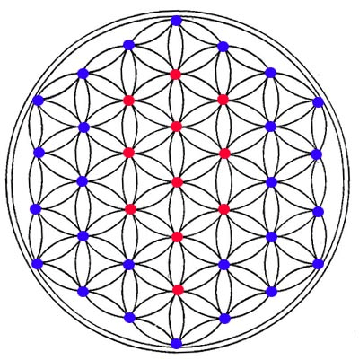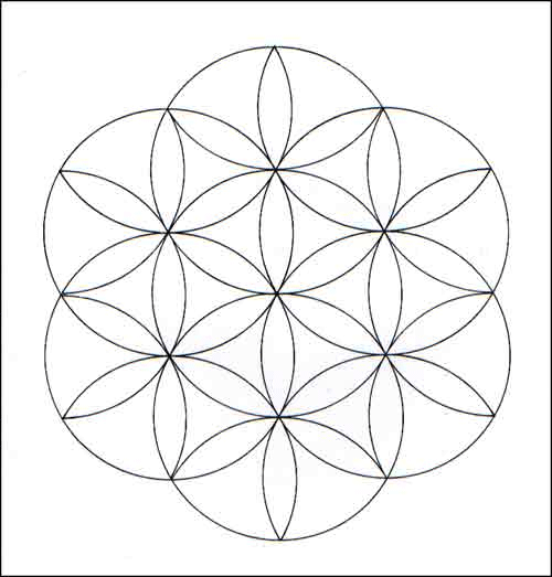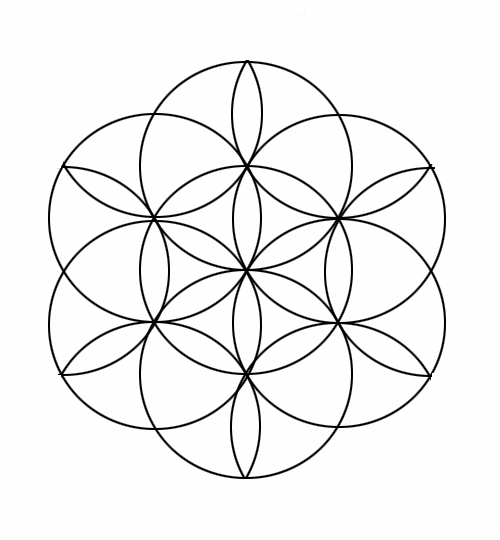 Remember we have four points, two serve as the centers of the two circles, and two on the cross sections of the two circles. Those two cross points seem the be the only likely places that would serve as centers for two more circles: But this doesn't look quite symmetrical, and the universe likes symmetry, thus it produces two more circles: Sometimes also depicted as follows when you fill in the remaining 'petals': The Tree of Life