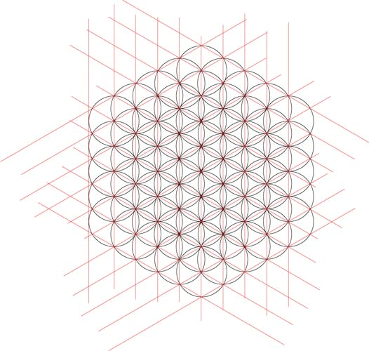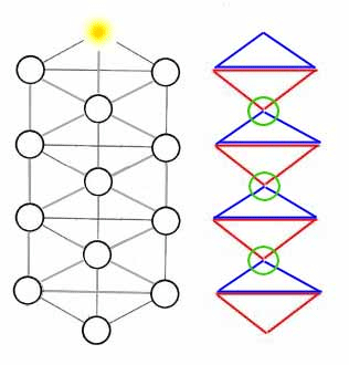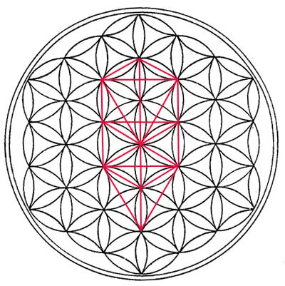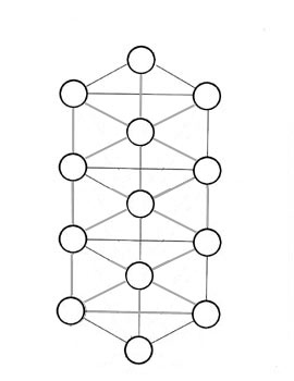 In regards to the spheres, a little comment: the level of subtle energy we are dealing with here is sometimes called etheric or ethereal. It is a subtle energy form that although invisible to our eyes, is nevertheless real, and can be perceived by those with psychic gifts. But it is now also being (re-)discovered by some scientists with interests into the old ether theories, and by those who talk about the so-called longitudinal scalar waves, the science of which is claimed to have been developed in secret by the military. This is not the place to go into this science or technology. You can look it up on the web. Back to the etheric pattern. The hexagonal pattern stretches out indefinitely as an all-encompassing web of energy. And the Tree of Life fits nicely on this pattern, and within the traditional Flower of Life within a circle. I am convinced that in esoteric circles where knowledge was transmitted by experience, the initiates were able to perceive the energy grid of the Flower of Life, and that the cabalists discovered, by actual visual experience, that part of it formed a Tree of Life in relation to the human body. For those who were not initiated, the Tree of Life just became book knowledge. One could argue that all this is just a mathematical coincidence, but I found the connection between the Tree of Life as formed by interlocking circles and by extension on the hexagonal grid and the flower of Life as an energy grid for a living being. It was a dowser who found that the Tree of Life is an actual energy template that relates to the physical human body. Joey Korn, a dowser, has an informative website at http://www.dowsers.com. You can find the whole story there, but I'll give you a summary. Previously he had found, by using L-rods, that humans had two lines of energy (or rays of light, as he calls them) that intersect and form at that intersection a vortex of energy. This is not a new concept as this is well known by dowsers of energy lines in nature. But with humans he believes that they anchor the soul to the body. Looking into it a bit further, he found that these intersecting lines were repeating themselves in a pattern. They also existed in people's bed, as an imprint of the person who sleeps in that bed. The energy of the 'bed pattern' always dosed positive. As he dowsed more he found that the lines always came in pairs like an X or a + form. In 1197 he came up with an initial pattern. He also found that with some people the 'bed pattern' wasn't always that strong, and sometimes some of the lines were missing. This would reflect the health situation of the person. The initial pattern was the result of dowsing the energies that were contained to the physical size of the bed. Later he found more lines that existed beyond the boundaries of the bed, but that also were part of the now more complex pattern. I want to point out here that originally he was looking within the confines of the physical dimension of the bed, and therefore the other lines didn't show up. It is well known that the drawback with dowsing is that one's results will reflect one's belief system about what one is dowsing. Having arrived at a certain pattern of the number of lines he had discovered so far, one day he picked up a book on Kabala and was surprised to find that the pattern he so far had found was the same as the Kabalistic Tree of Life minus a number of lines he had not dowsed yet. The next morning he dowsed again the 'bed pattern' and indeed he found the remaining pairs of energy lines. Now he had found the entire Tree of Life energy lines/pattern that is present in the energy field of every person, and by extension in their beds as an imprint. I contacted