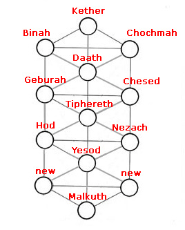 fits perfectly in here: Are there more hidden Sephiroth? we will go into this in the following chapters. When I am studying esoteric systems, I always ask why things are the way they presented. I question even established doctrines. When you take everything for granted, you often miss the point. The following flowed forth naturally when I studied the Tree of Life, because not only are there differences between kabbalists on certain issues, but also certain explanations don't seem to make sense, at least to me. I think the traditional Tree of Life is incomplete because there are Sephiroth and paths missing, which when added makes all the other things come into place. In the following I will explain why I feel the need for a corrected Tree of Life and why I think this is a better representation of the whole system, without invalidating the traditional Tree of Life. It is all about symmetry and geometry. First a little word about the paths: The traditional paths are not that logical to me. Why are Binah and Chohmah connected with Tiphereth, and Hod and Nezach with Malkuth, but Chesed and Geburah are not connected with Yesod? Also, and more important, one Sephiroth flows forth from another in a well defined order when going down the Tree. First we have Kether, then Chochmah, then Binah, then Chesed and so on. Although Chesed flows forth from Binah the Tree of Life (as shown by the kabbalists) never shows a path between those two Sephirah. Because Chesed flows forth from Binah there must be a path. Even when Daath is taken into consideration there must be a path between Binah and Daath and between Daath and Chesed. Let's start with what is to me the prime question: the missing Sephiroth. First and for all, Daath should be included in the Tree of Life. The cabbalists always stress that the Sephiroth work in pairs (one each on the + and - pillar) producing a third one on the middle pillar that represents the equilibrium of its two 'parent' Sephiroth. When Daath is mentioned it is the 'child' of Chochmah and Binah. Tiphereth is the result of Chesed and Geburah, Yesod is the result of Hod and Netzah. But what is Malkuth the child of? In the traditional Tree of Life, it kind of dangles at the end of the Tree, not being the result of polar opposites. If there is a place in the universe where polar opposites play a prominent role, it is the physical world. Malkuth, like Yesod, Tiphereth and Daath must be the result of two 'parent' Sephiroth, and there is indeed a place for them. In Nature we find symmetry everywhere. Symmetry creates balance and harmony. The original person who came up with the Tree of Life might not have seen the entire picture. In my opinion the traditional Tree of Life does not feel harmonious, complete nor coherent. As we will progress further into our study we will see that the underlying structure is completely symmetrical. So for now we draw the Tree of Life as a symmetrical structure. In regards to the triads. Traditionally a triad is explained as the balancing of two Sephiroth into a lower third one. Thus a triad is a downward pointing triangle. I think that one can equally say that the balancing goes both upward and downwards. Basically the middle pillar is balanced by the left and right pillar. By extension, the entire tree (in its complete symmetrical form) balances itself in all directions, because everything is symmetrical. It is one thing to change the traditional Tree of Life, but how does this impact the other kabbalistic doctrines related to the Tree? With the traditional Tree of Life different kabbalists place certain subjects on the Tree in different ways, without any explanation as to why they do so. For example, the Veil is sometimes placed under Yesod, sometimes above; or the four Worlds are divided differently over the Tree. With the new Tree of Life I will explain why this system allows for a more coherent and meaningful assignment of these issues to the Tree. First, we have to keep in mind that although Kether is depicted as a Sephirah like all the others, it is actually a direct emanation from the Divine, a Crown that sits upon the Tree of life, as a crown sits on the head of a man, sometimes it is considered a point of light. The Sephiroth When numbering the Sephiroth, Daath gets included, as well as two new Sephiroth above Malkuth. In my opinion, the two new Sephiroth are energy centers that could equal Instincts and Desire, as they are above the physical body but below the realm of Yesod, that among other things is associated with sexual energies. We still have the same three pillars, positive, negative and neutral, each containing four Sephiroth. In the process of emanation and creation, there is the same flow of energy going down the Tree. Every time when the Shekinah rests, a Sephirah is created. When the Shekinah rises, or when one's consciousness is expanding and rising up the Tree, the reverse path is taken. The flow of energy is all regular, no big leap from Binah to Chockmah, or a sudden vertical fall from Yesod to Malkuth. This is a much more regular, symmetrical, balanced flow of energy than in the traditional Tree of Life. With the New tree of Life, the four Worlds each contain a triad of Sephiroth. Each triad is formed of two opposite Sephiroth with a resulting equilibrium, a third Sephirah on the middle pillar. We have four Sephirah on each of the tree pillars. The Sephiroth on the middle pillar also acts as a transformation station between two worlds, except for Malkuth where the creation process stops. (Later we will see that the Sephiroth on the middle pillar are places for transformation of consciousness.) This is similar to the philosophy of the chakras. Chakras are also transformation stations where energy is transformed from one level into another. With this new Tree of Life we have a real dynamic flow of divine energy throughout the Tree. We have already shown that each world is equally divided over the Tree, and each world has a tr