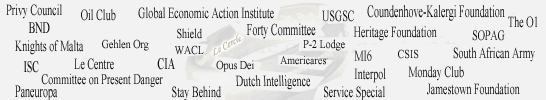 Some more Cercle members. King Hussein of Jordan used to receive millions from the CIA. Sultan Qaboos from Oman overthrew his father in 1970 (which was a good thing) with help from "British advisors" and privatized the oil economy. He is rumored to be gay by almost his entire population, which is quite a sin in an Islamic country. Both Hussein and Qaboos were advised by Cercle member Air Marshal Sir Erik Bennett. Turki from Saudi-Arabia is reported to have met his old protege Osama Bin Laden as late as July 2001, together with the CIA, and resigned 10 days before 9/11 as head of Saudi intelligence. Auchi was part of Saddam Hussein's inner circle and is standing here next to Prince Andrew at the Anglo-Arab Organization. Actually, it isn't known if former Nazi spy chief General Reinhard Gehlen attended Cercle meetings, only that he was very interested in the Cercle and that he recruited its founder, Jean Violet, as an intelligence agent. Details can be found in the membership list, which features very detailed biographies often with a number of newspaper excerpts. Even though its members have been involved in intrigues around the world, the Cercle's main purpose has always been to discuss issues and possible action relating to European integration. The vision of the original French and German founders, as representatives of the Paneuropa movement, seems to have been a strong Catholic-dominated Europe, led by a Franco-German axis. Historically, you'll find a close cooperation between the Vatican-Paneuropa network (from which the Cercle emerged) and the right wing Christian Democratic parties in countries as Germany, Italy, France, and Belgium. It went the same way in Spain, although a democratic system did not exist there until after the death of Franco. IN GERMANY the main players were CSU members Otto von Habsburg, Franz Joseph Strauss, Count Hans Huyn, and several of their aristocratic friends like the Thurn und Taxis and Thyssen-Bornemisza families. Their connections to Opus Dei and the Knights of Malta have already been discussed. Let's also not forget Paneuropa member Konrad Adenauer, the long time Chancellor of Germany who signed the 1957 Treaty of Rome for Germany. Adenauer, a co-founder of the Christian Democrat Union (CDU) - the national party of the Bavarian CSU - received the Magistral Grand Cross from the Knights of Malta and the Charlemagne award from the Paneuropa Union. Franz Josef Bach, the personal assistant of Adenauer, is likely to have played an important behind the scenes role as a long time organizer of Cercle meetings. Adenauer was a founding member of Le Cercle. IN ITALY the Opusian Cercle member Giulio Andreotti was one of the main behind the scenes players from the late 1950s to the early 1990s. He started his career under Paneuropa supporter Alcide de Gasperi, one of the early builders of Europe and likely someone who was recruited into the Cercle. Statements from Roberto Calvi that Andreotti was the real head of the P2, with Francesco Cosentino and Umberto Ortolani just beneath him, are entirely possible (162). Although Licio Gelli, nicknamed "Italy's puppet master" for heading the P2, was a member of the Knights of Malta, like Andreotti and Ortolani, Gelli did not have the background to have been any kind of top man. Gelli's foreign puppet masters were Cercle member Henry Kissinger from the White House, NATO official Alexander Haig, and rogue CIA official Ted Shackley. Frank Gigliotti, a ranking US Mason and former OSS agent, was another one of Gelli's immediate instructors (163). Andreotti has numerous accusations against him that he worked with the mafia (and the CIA) to keep his Christian Democrat Party in power. There's also an accusation that he personally ordered an assassination to keep some personal secrets from leaking out. Andreotti was the first to acknowledge the existence of a European Stay-Behind army, named Gladio in case of Italy. As for Italy's nobility, the earlier-mentioned Prince Carlo della Torre e Tasso is a board member of the Coudenhove-Kalergi Foundation and Prince Carlo de Bourbon, the Duke of Calabria, is head of the Vatican-recognized Italian branch of the the Sacred Military Constantinian Order of St George. It's a Catholic chivalric order, but has recently also invited a small number of non-Catholics, including Cercle chairman Lord Norman Lamont (Privy Council; Rothschild; chair Oil Club) and Cercle member Anthony Cavendish (MI6; not of the Dukes of Devonshire). The controversial Cercle member Nadhmi Auchi (did illegal arms transfers for Saddam) has been awarded by the order. The Catholic Duke of Norfolk (together with the Cecils the most influential family in the history of Britain; British liaisons to the Vatican for centuries; Roxburghe Club member with the Cecils, Cavendishes, Rothschilds, Oppenheimers, and formerly Paul Mellon) and Lord Guthrie (SAS commander; Gold Stick to the Queen; Pilgrims Society; Knights of Malta; Rothschild) can also be found among the British members of the Sacred Military Constantinian Order (164). The controversial Duke of Savoy is another important family in Italy, but has not been tied directly to Paneuropa or Le Cercle. CERCLE MEMBERS FROM BELGIUM have yet to be identified, but the group they must have come from is rather limited. Take former defense and prime minister Paul Vanden Boeynants and his sidekick Baron Benoît de Bonvoisin, whose father had been a director at Société Générale (still the major pillar of the Belgian economy and the Vatican-linked aristocracy) and an initial Bilderberg participant. Both were reportedly members of Opus Dei. Vanden Boeynants and Benoît de Bonvoisin were two of the founders of Cercle des Nations in 1969, an aristocratic Belgian club with Jean Violet as one of the few foreign members. Cercle des Nations was another hard-right offshoot of Paneuropa activities and had about 80 members when it first opened. Vanden Boeynants is also said to have been involved