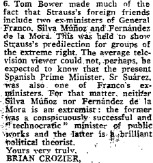 German Wikipedia article on Otto von Habsburg [176] February 24, 1967, Time Magazine, 'Struggle for Freedom': "The most talked-about subject in Spain last week was something that did not happen: the failure of the Cabinet to pass a bill that would at last grant a measure of religious freedom to Spain's tiny non-Catholic minority... For years, Spain's non-Catholics have almost been non-people, barred from participating in the mainstream of Spanish life. They were, in fact, not even officially recognized as having been born, married or buried—since Spain acknowledged those milestones only when they were sanctioned by the Catholic clergy... Castiella, who has championed the bill for ten years, nevertheless pressed on with his familiar argument: granting religious freedom was not only the right thing to do morally but also the right thing for Spain if it wants to become a respected member of the world community. Several of the ministers who are identified with the Opus Dei laymen's organization supported him. But the opposition quickly closed ranks. Interior Minister Camilo Alonso Vega, 77, who as Spain's top cop maintains that the Spanish are "the most unruly people in Europe", argued that religious freedom would only stir up trouble, just as the earlier measures granting workers and students more freedom resulted in the present rash of strikes and student riots. On a more philosophical level, Public Works Minister Federico Silva Munoz, 43, contended that granting religious liberty to minority sects would shatter Spain's spiritual unity. The ministers connected with the military supported the views of Vega and Munoz..." [177] October 30, 1969, The Times, 'Riot as Franco Alters Cabinet': "The Spanish Government officially announced the names of General Franco's new Cabinet tonight, and confirmed earlier speculation that members of the powerful Roman Catholic lay organization Opus Dei will dominate Spain's future... Only four of the 18 Cabinet posts are unaffected... The new Cabinet is as follows... Public Works. - Federico Silva Munoz (unchanged)." [178] April 11, 1970, The Times, 'Resignation of Spanish Minister': "One of General Franco's "technocrat" ministers resigned today, possibly as the result of a deep ideological split in the government, reliable sources said. Senor Federico Silva Munoz, aged 46, Minister of Public Works since June, 1965, was said to have given his resignation to the General this morning... The present Under-Secretary for Foreign Affairs, Senor Gonzalo Fernandez de la Mora, was said to have been chosen as the new Minister of Public Works. Like most of the present Cabinet, and unlike his predecessor, he is known to be a sympathizer with, if not a member of, the powerful Roman Catholic lay organization Opus Dei... [Munoz] is also thought, as a technocrat without any strong political orientation, to have been opposed to the reactionary political attitude of of Vice-President Carrerro Blanco and some other ministries." Interesting, Munoz was among the most reactionary politicians of the post-Franco government. [179] October 11, 1976, The Times, 'Suarez regime challenged from the right as new party is launched by Franco era politicians': ";Senor Silva Munoz, now head of Campsa, the oil concern;" [180] July 4, 1976, The Modesto Bee, 'King Juan Carlos names new premier of Spain': "A third name submitted to the monarch by the Council of the Realm, his top advisory body, was that of Federico Silva Munoz, 52, a Christian Democrat and former public works minister." [181] Winter 1986, Issue 25, Covert Action Information, 'Knights of Darkness - The Sovereign Military Order of Malta': "Recognition of the importance of Opus Dei at the highest levels of SMOM had already been established in the summer of 1976 when King Juan-Carlos, himself a Knight of Malta, chose Adolfo Suarez, a member of Opus Dei, as new chief of government following the death of Franco. (Point de Vue, January 14, 1983; Paris.)" [182] October 11, 1976, The Times, 'Suarez regime challenged from the right as new party is launched by Franco era politicians'. Munoz, Fernandez de la Mora, Fraga, and Rodo are mentioned as founders of Allianza Popular, together with two other anonymous ex-Franco ministers. [183] January 10, 1979, El Pais, 'Silva Muñoz unites with the ultraright to be presented at the elections' (translated from Spanish):"Federico Silva, Gonzalo Fernández de la Mora, Raimundo Fernández Cuesta, Blas Piñar, José Antonio Girón and other political leaders have formed a coalition named Union of the Right [that] involves all political forces to the right of the coalition Fraga-Areilza-Osorio, in other words, the Derecha Democrática Española and the gathering of national forces [a reference to Pinar's New Force, which had the aim of "gathering the national forces"]." This is a rough translation (as my Spanish is very rusty) from "... Girón y otros dirigentes políticos han formado una coalición unitaria que se llamará Unión de Derechas y que agrupa a todas las fuerzas políticas situadas a la derecha de la coalición Fraga-Areilza-Osorio, es decir, la Derecha Democrática Española y las llamadas fuerzas nacionales." [184] December 1, 1979, El Pais, 'The Constitution is a permanent factor of distortion, according to Federico Silva' (translated from Spanish): "The Constitution that was passed and that we accepted, even though we don't agree with most aspects of it, will continue be a permanent factor of distortion on the national life and of the life of the right[-wingers] in particular, says Federico Silva Munoz, promoter of Derecha Democrática Española, in a declaration to the European Press Agency. Their [political] group will celebrate their first national congress on the 8th and 9th of this month." [185] September-October 1997, Issue 85, Razón Española (translated from Spanish): "I met Federico in the 1940s at a conference of the National Catholic Association of Propagandist to which he be