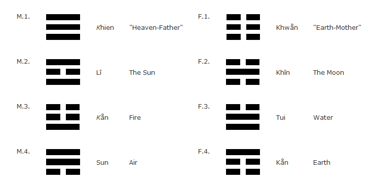 In Diagram 1, "the world where no dogs are" included the whole of my study; in Diagram 2 that absence-of-dog is no longer there; so one or more of them must have got in somehow. That's that; I know it may be a little difficult at first; fortunately there is a different way—the Chinese way—of stating the theorem in very much simpler terms. S. The Chinese, like ourselves, begin with the idea of "Absolute Nothing." They "make an effort, and call it the Tao;" but that is exactly what the Tao comes to mean, when we examine it. They see quite well, as we have done above, that merely to assert Nothing is not to explain the Universe; and they proceed to do so by means of a mathematical equation even simpler than ours, involving as it does no operations beyond simple addition and subtraction. They say "Nothing obviously means Nothing; it has no qualities nor quantities." (The Advaitists said the same, and then stultified themselves completely by calling it One!) "But," continue the sages of the Middle Kingdom, "it is always possible to reduce any expression to Nothing by taking any two equal and opposite terms." (Thus n = (-n) = 0.) "We ought therefore to be able to get any expression that we want from Nothing; we merely have to be careful that the terms shall be precisely opposite and equal." (0 = n + (-n). This then they did, and began to diagrammatize the Universe as the Ηa pair of opposites, the Yang or active male, and the Yin or passive Female, principles. They represented the Yang by an unbroken ( ——— ), the Yin by a broken ( — — ), line. (The first manifestation in Nature of these two is Thƒi Yang, the Sun, and the Thƒi Yin, the Moon.) This being a little large and loose, they doubled these lines, and obtained the four Hsiang. They then took them three at a time, and got the eight Kwa. These represent the development from the original Œ {S.B. cap "I"} to the Natural Order of the Elements. I shall call the male principle M, the Female F.