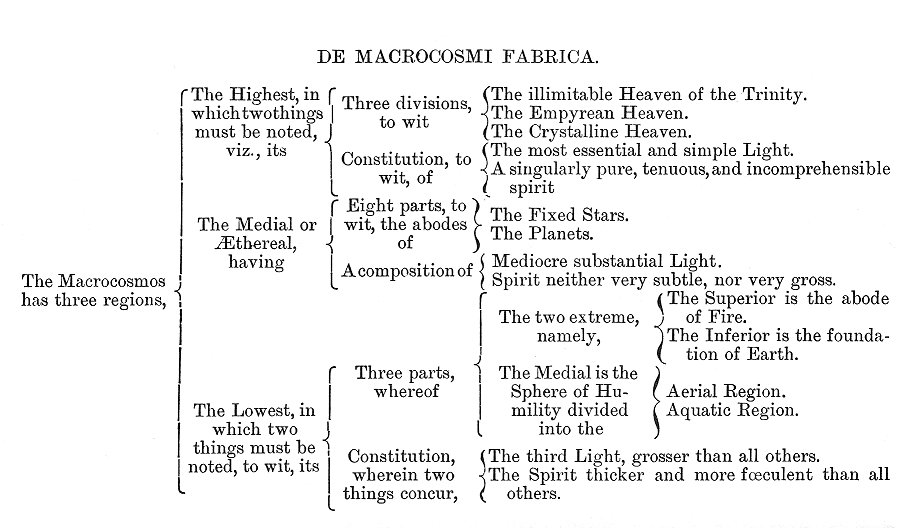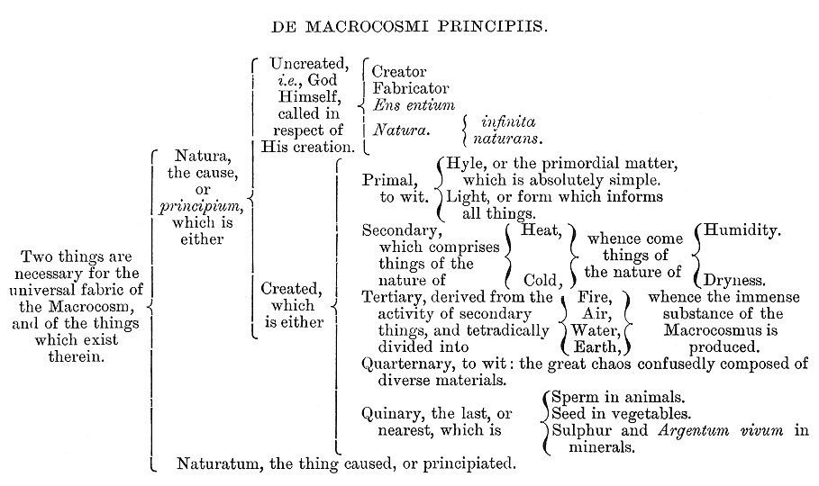 foundation of the true science. Before the spagirical separation which the Word of God, or divine Elohim, effected in the six days of creation, the heavens and earth were one deformed, rude, undigested mass, complicitly comprehended in one dark abyss, but explicitly as yet nothing. This nothing is compared by St Augustine to speech, which while it is in the speaker's mind is as nothing to the hearer, but when uttered, that which existed complicitly in animo loquentis, is explicitly apprehended by the hearer. This nihilum or nothing is not a nihilum negativum. It is the First Matter, the infinite, informal. primordial Ens, the mysterium magnum of the Paracelsists. It existed eternally in God. If God had not produced all things essentially out of Himself, they could not be rightly referred to Him. The primeval darkness is the potentia divina as light is the actus divinus--the Aleph tenebrosum and Aleph lucidum. Void of form and life, it is still a material developing from potentiality into the actual, and was informed by the Maker of the world with a universal essence, which is the Light of Moses, and was first evolved in the empyrean heaven, the highest and supernatural region of the world, the habitaculum fontis lucidi, the region not of matter but of form--form simple and spiritual beyond all imagination. There is a second spiritual heaven, participating in the clarity and tenuity of the first, of which it is the base; this is the medial heaven, called the sphęra ęqualitatis and it is corporeal in respect of the former. The third heaven is the locality of the four elements. The progression of the primordial light through the three celestial spaces was accomplished during the first three days of creation. Christ the Wisdom and Word of God, by His apparition out of darkness, that is, by the mutation of the first principle from dark Aleph to light Aleph, revealed the waters contained in the profound bosom of the abyss, and animated them by the emanation of the spirit of eternal fire, and then by his admirable activity distinguished and separated the darkness from the light, the obscure and gross waters from the subtle and pure waters, disposing the heavens and spheres, as above stated, and dividing the grosser waters into sublunary elements. These elements are described as follows:--Earth is the conglomeration of the material darkness and the refuse of the heavens; Water is the more gross spirit of the darkness of the inferior heaven, nearly devoid of light; Air is the spirit of the second heaven; Fire, the spirit of the darkness of the Empyrean heaven. Fludd's theory of the Macrocosmus is enunciated in the following manner. DE MACROCOSMI PRINCIPIIS. DE MACROCOSMI FABRICA. According to Fludd's philosophy, the whole universe was fashioned after the pattern of an archetypal world which existed in the Divine ideality, and was framed out of unity in a threefold manner. The Eternal Monad or Unity, without any egression from his own central profundity, compasses complicitly the three cosmical dimensions, namely, root, square, and cube. If we multiply unity as a root, in itself, it will produce only unity for its square, which being again multiplied in itself, brings forth a cube which is one with root and square. Thus we have three branches differing in formal progression, yet one unity in which all things remain potentially, and that after a most abstruse manner. The archetypal world was made by the egression of one out of one, and by the regression of that one, so emitted, into itself by emanation. According to this ideal image, or archetypal world, our universe was subsequently fashioned as a true type and exemplar of the Divine Pattern; for out of unity in his abstract existence, viz., as it was hidden in the dark chaos, or potential mass, the bright flame of all formal being did shine forth, and the Spirit of Wisdom, proceeding from them both, conjoined the formal emanation with the potential matter, so that by the union of the divine emanation of light and the substantial darkness, which was water, the heavens were made of old, and the whole world. God, according to these abstruse speculations, is that pure, catholic unity which includes and comprehends all multiplicity, and which before the objective projection of the cosmos must be considered as a transcendent entity, reserved only in itself, in whose divine puissance, as in a place without end or limit, all things which are now explicitly apparent were then complicitly contained, though in regard to our finite faculties it can only be conceived as nothing--nihil, non finis, non ens, aleph tenebrosum, the Absolute Monad or Unity. Joined to the cosmical philosophy of Robert Fludd, there is an elaborate system of spiritual evolution, and the foundation of both is to be sought in the gigantic hypotheses of the Kabbalah. His angelology is derived from the works of pseudo-Dionysius on the celestial hierarchies, and he teaches the doctrine of the pre-existence of human souls, which are derived from the vivifying emanation dwelling in the Anima Mundi, the world's spiritual vehicle, the catholic soul, which itself is inacted and preserved by the Catholic and Eternal Spirit, sent out from the fountain of life to inact and vivify all things. These mystical speculations, whatever their ultimate value, are sublime flights of an exalted imagination, but they are found, in the writings of Robert Fludd, side by side with the crudest physical theories, and the most exploded astronomical notions. He denies the diurnal revolution of the earth, and considers the light of all the stars to be derived from the one "heavenly candle" of the sun. Rejecting the natural if inadequate explanations of Aristotle and his successors, he presents the most extravagant definitions of the nature of winds, clouds, snow, &c. The last is described as a meteor which God draweth forth of His hidden treasury in the form of wool, or as a creature produced out of the air by the 