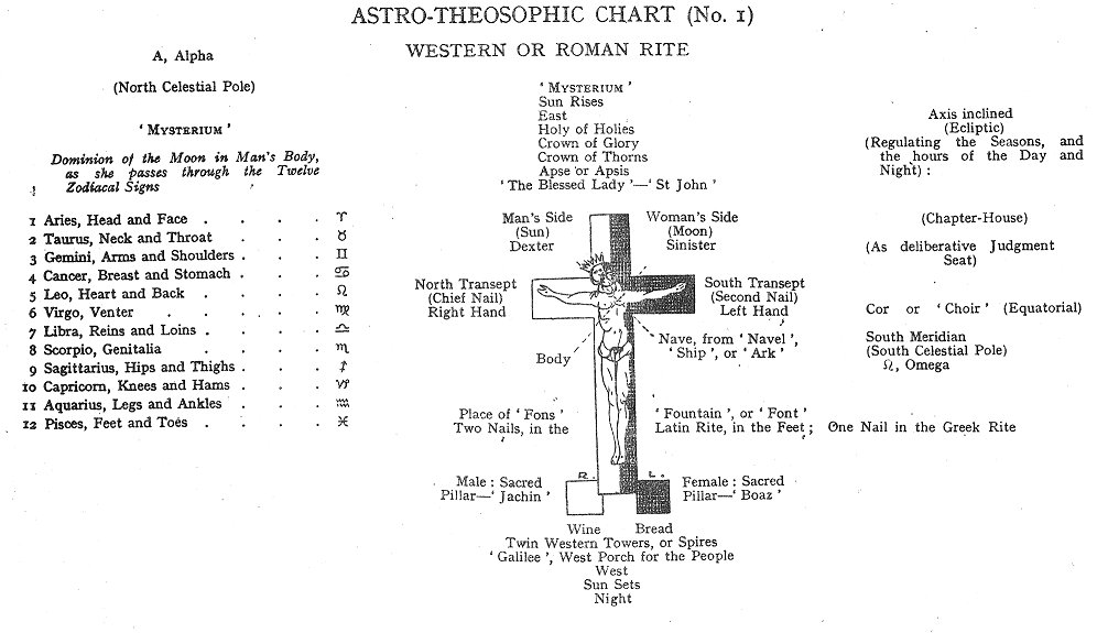 CHAPTER THE NINTH: ASTRO-THEOSOPHICAL (EXTRA-NATURAL) SYSTEM OF THE ROSICRUCIANS-THE ALCHEMIC MAGISTERIUM OR 'STONE' THE letters of all languages are significant marks or symbols, which have the 'Twelve', or rather the original 'Ten Signs' of the 'Zodiac' for their beginning. Of these letters there is a certain group which has, in the characters of all languages, a secret hieroglyphical, hagiographical reference to the originally single, and afterwards double, sign 'Virgo-Scorpio', which is supposed to give the key to the secret or cabalistic 'Story of Creation'. These letters are S and Z, L and M; or rather a group, which is marked by Λ, Π, Μ, Σ, S, Z--L, M, V, W. The significant aspirates, or 'vowel-sounds', follow the same rule. The 'Snake-like Glyph', or 'mystery of the Serpent', or disguise, in which the 'Recusant Principle' is supposed to have invested himself, has coiled (so to say), and projects significant curves and inflections, through all this group of letters and sounds; which is perceivable, by a close examination and quick ear, in all languages, living and dead. The sigma presents itself to the eye (that recognizes) in the Hebrew, the Sanscrit, the Persian, the Arabic, the Coptic, the old Gothic, the Georgian or Iberian, the Ancient Armenian, the Ethiopic or Gheez, the Sclavonic, the Greek, the Latin, the Samaritan, the Irish, the Etruscan--of all which alphabets, and the symbols serving for their 'numerals', we had prepared a comparative table, to prove the identity of the sign 'Virgo-Scorpio' and its ciphers; but we forbore in deference to our limits (and from other circumstances), which did not advisedly admit of the addition. A comparative display of all marks or symbols which give occult expression to the 'female side of nature', and its astronomical and astrological signs, affords the same result of identity. The marks of the 'signs' ♍ and ♏, and their ciphers, are interchangeable, and reflect intimately from one to the other. It must be remembered that the sign Libra--our modern September--the 'hinge-point' or 'balance-centre' of the two wings of the celestial Zodiac--was an addition by the Greeks. Here, according to the Sabæan astrological tradition, the origin of 'Good and Evil', of the malific and the benevolent 'cabalistic investments of nature', the beginning of this 'two-sexed', intelligent sublunary world, were to be found--all contained in the profoundest mysteries of this double sign. The cabalistic theory, and the Chaldæan reading is, that the problems of the production of the sensible world are not to be read naturally, but supernaturally. It was held that man’s interior natural law is contained in God’s exterior magical law. It followed from this that present nature is secondary nature: that man is living in the 'ruins' of the angelic world, and that man himself is a 'ruin'. Man fell into the degradation of 'nature' as the result of the seduction by the woman (to sexual sin), which produced the 'generations' according to Man’s ideas. The strange theories as to the history of the first world prevalent among the Cabalists imply that the appearance of 'woman' upon the scene was an 'obtrusion' in the sense of a thing unintended; even accidental and unexpected in a certain (non natural) sense. Thus her advent upon the scheme of creation--to use one of their mysterious expressions--was at a late spoiled and evil period of the world, which had sunk from the 'supernatural' into the 'natural'. As woman had no part in the earliest world, and as her origin was altogether of another nature and from other sources than that of man, the traces of her introduction, and the hints as to her true character, are to be found mystically in the original sign 'Virgo-Scorpio', double-sided (yet identical) at first but afterwards divided. These divided 'personalities' were set thereafter in mythologic opposition. The reader is referred to the previous Zodiac, fig. 12, where will be found the diagram illustrative of this idea, which was originated amidst the magic of the Syro-Chaldæans; it yet remains the key to all the mythologies and to all the religions. The sign 'Virgo-Scorpio' stands, in the present order of things, or in this non-angelic or mortal world, as a divided sign, because in the 'World of Man' as 'born of Woman'--enmity has been, placed between the 'Snake' and the 'Woman'. Thenceforth, from the 'Fall', and as a consequence of it, they are, in opposition. The sign of the 'Balances' is placed between, as the rescuing heavenly shield, miraculously interposed, separating, as the tremendous 'Ægis', the two originally conjoint signs, and simultaneously presented 'both ways' (to speak in figure), defending 'each from destruction by either'--'until the time shall be complete!'--which means the Apocalyptic 'New Heaven and New Earth'. Marks, movements, or influence from the side of 'Scorpio', or from the sinister side, are malign, and mean danger; because they represent the 'Old Serpent', or, in other terms, the 'Great Deep', or 'Matter'. Of such magic character are the letters 'S' and 'Z', and all their compounds; because this originally 'single' sound, or letter 'S-Z, Z-S', came into the world representing its sinful side. Man is pardoned through the 'Promise to the Woman', and 'Woman' is saved because through her the 'Saviour of the World', or the 'Rescuer of the World', or the 'Deified Man', or the 'Sacrifice', came into the world. Woman has the intermediate office of reconciling and consoling. In the abstract sense, as 'virgo intacta' (or holy unknowing means), woman is free and unconscious of that deadly 'Original Sin', which in the disobedience to the Divine Command (to refrain from that 'Fruit' with 'Eve', or with the 'Natural Woman'), lost 'Man' his place in the scheme of the 'Immortal World'. All this is part of the cabalistic view of the Mysteries of Creation. The Cabalists say that the 'Lost Man' Adam should not have yielded to those which he fou