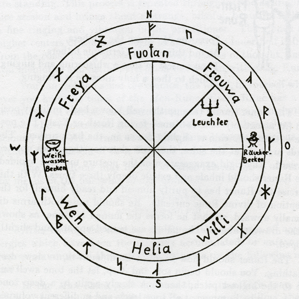 Rune-magic is the great knowledge of cosmic energies, the recognition of hidden energies of nature, of the subtle heavenly, as well as earthly streams, waves, entities, and powers. All forms of higher wisdom, all secret knowledge of the world, are but fragments, and through the course of time have been for the most part distorted and corrupted; but at one time it had its origin in the divine, Aryan magic of the Runes. All languages of the world are derived from the Aryo-Germanic mother-tongue, which is both magical and alive. The Germanic Runic script is the script of all scripts. Runes are not just letters or verbal symbols, but primal symbols of a living magical nature which whisper to us. These may be experienced physically through Runic postures and dances and are useful for your own well-being and even for the blessing of all mankind. Whoever physically forms and experiences the Runes in a pure and conscious manner, will have great secrets opened to him, if he practices, vibrates, and dances in the radio waves, subtle currents and flowing energies of the All. Accompanying ideal higher development, clairvoyance, astral perceptions, heightened psychic ability and prophetic vision will arise in the Runer, in the practitioner. In the small manuscript before you I can give only a few gems from the great treasure trove of Aryan wisdom and Rune-magic, but these will be of great use to the reader and will lead him into the Way of the Grail. To anyone who has greater interest in Runic history, magic and mysteries I recommend my work, Heilige Runenmacht. [1] The following exercises and instructions may be undertaken only with noble and pure thoughts -- the blessings of the Runes will not fail.