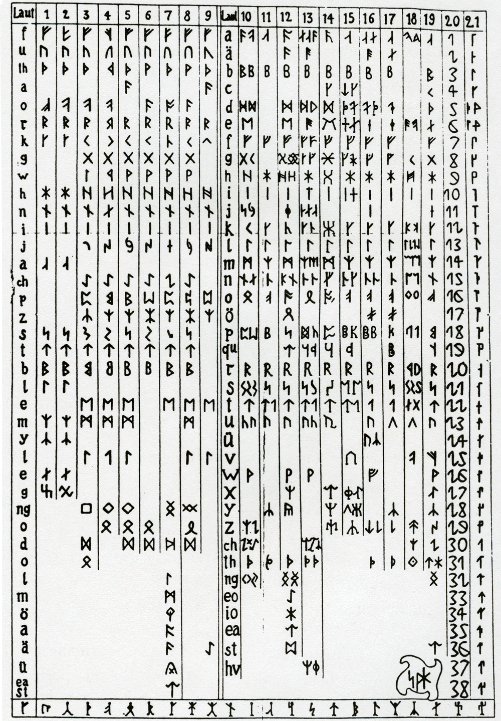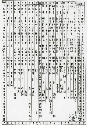Runic table portrays the holy whispering Row of Man-Runes. I include